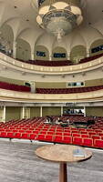 Diesmal ging es nämlich von Zwickau nach Plauen. Zuerst erhielten die Reisenden eine Führung durch das Vogtlandtheater vom Vereinsmitglied Claudia Kuntze. Das im klassizistischen Stil prachtvoll erbaute Theater wurde 1898 der Öffentlichkeit übergeben. Seinen Charakter hat das Haus auch nach mehreren Renovierungen beibehalten. Die Stadt Plauen war im Krieg zu 75% zerstört worden, aber das Theater hatte es wenig getroffen, sodass der Spielbetrieb bald nach Kriegsende wieder aufgenommen werden konnte. Bis zur Fusion mit dem Theater Zwickau im Jahr 2000 war das Vogtlandtheater ein eigenständiges Haus. Jetzt hat sich schon viele Jahre lang die Fusion bewährt, auch wenn die Reisetätigkeit den Mitarbeitern doch einiges abverlangt.