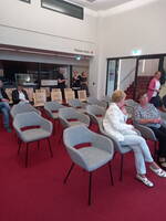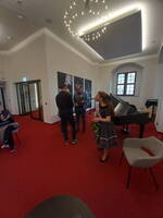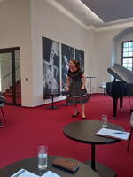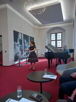 Musikalisch wurden wir von Sabrina Pankrath (Schauspielerin/Sängerin) und Peter Foggitt (Korrepetitor) begrüßt. Frau Pankrath machte uns mit den Sorgen eines Mädchens im 4. Stock vertraut und lud in "Irgendwo auf der Welt" zum Träumen ein. Herr Foggitt sorgte für eine Überraschung: Er komponierte nach Zuruf von 8 Noten eine Sonate in 3 Sätzen und trug sie am Flügel vor. Unter lang anhaltendem Applaus wurde beide Künstler verabschiedet. Über Blumen und ein Präsent haben sie sich sehr gefreut.