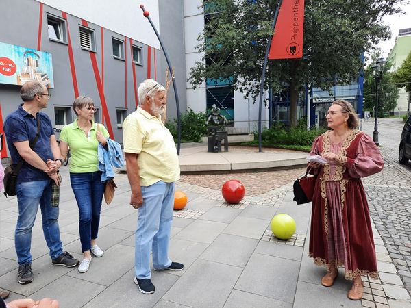 Auf den Spuren der Neuberin waren wir am 27.06.2023 unterwegs in Zwickau. Dazu hatte sich Frau Dr. Ute Haese in ein Gewand gekleidet, das uns gleich in die Zeit von Caroline Neuber zurückversetzte. Natürlich waren alle gespannt, möglichst viel Neues über das Leben unserer Namenspatronin zu erfahren - und das ist auch auf beeindruckende Weise gelungen. Von ihrer schwierigen Kindheit (geb. 1697 in Reichenbach) mit dem frühen Tod der Mutter (1705) und der mehrfachen Flucht vor der Tyrannei des Vaters (1714 und 1717), welche sie für 13 Monate in Haft brachte, wussten die Mitglieder unseres Fördervereins natürlich. Jetzt wissen wir auch, wo sich das Wohnhaus befand, in dem Caroline mit ihrem reichen Vater, der "sehr strenge und schroff zu ihr" und auch zu seiner Frau war, stand.
