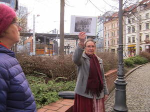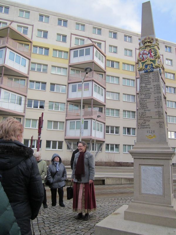 Begonnen am Gewandhaus ging die Route zum Puppentheater, vorbei an der Stelle des Elternhauses (Internat der Westsächsischen Hochschule),zur Postsäule; weiter zur Bibliothek, zum Schiffchen, zur Alten Münze, in die ehemalige „Neuberin“-Straße (heute Katharinenstraße) und zur Paradiesbrücke, wo sich der Kreis schloß, der interessante Vortrag endete.