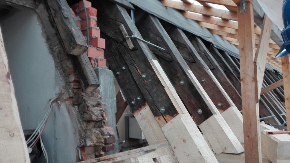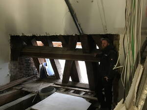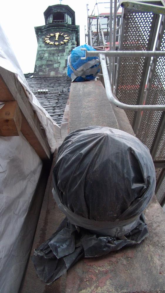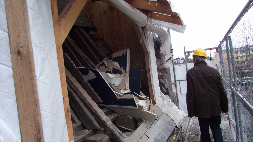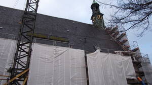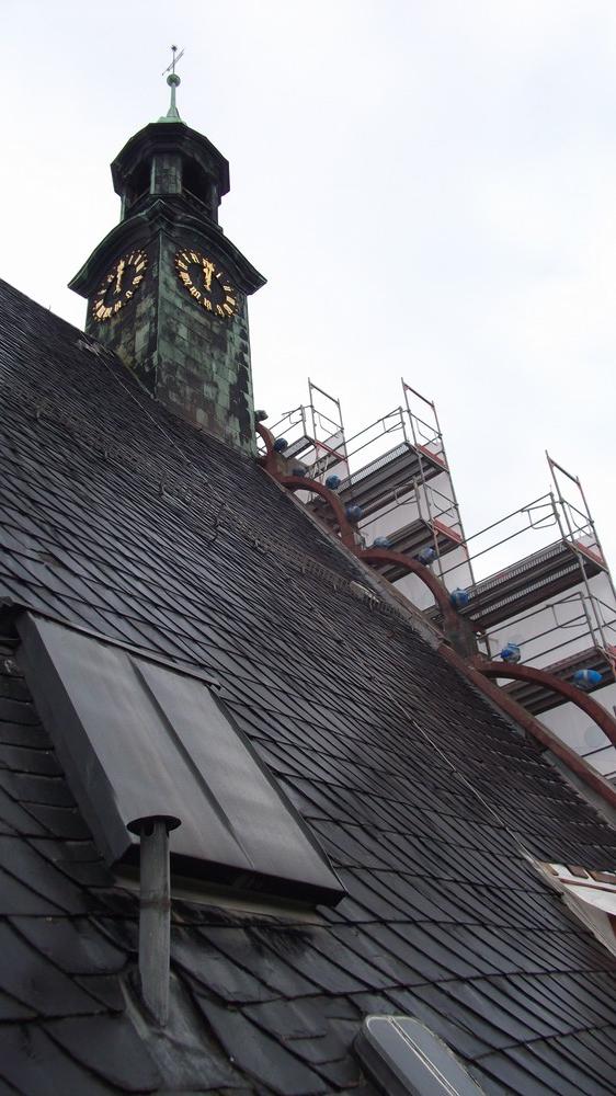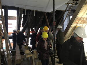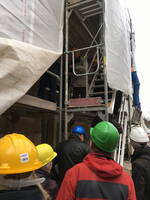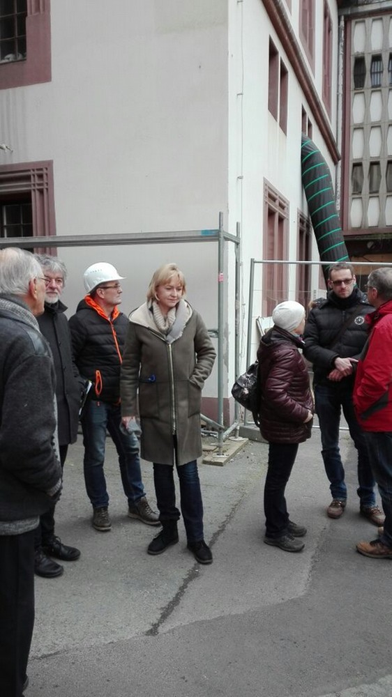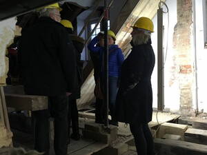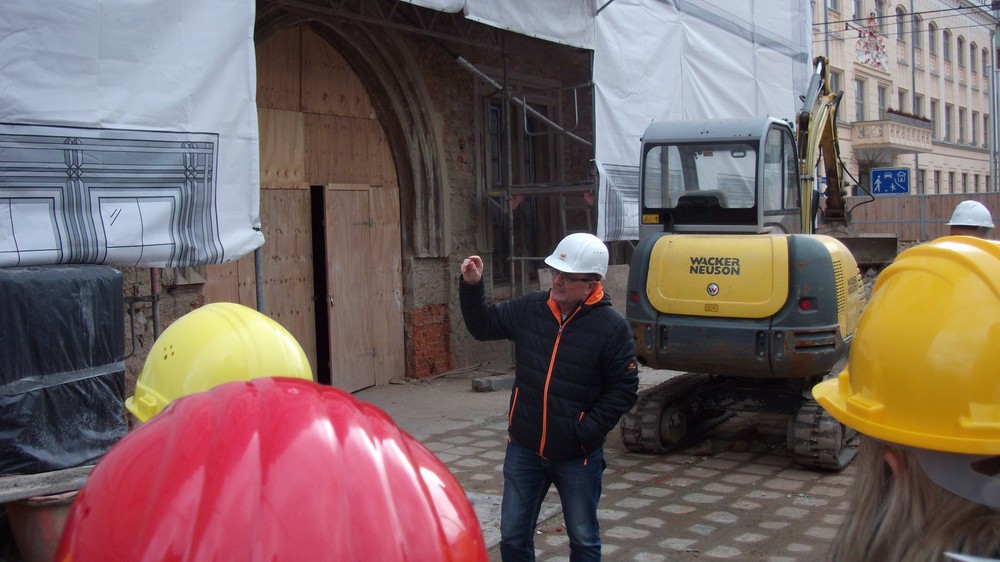 Herr Hertrampf führte uns durch das Gewandhaus und erklärte die derzeitigen Baumaßnahmen. Wir erfuhren u. a., dass im Inneren derzeit im Erdgeschoss ein sogenannter Opferputz angebracht wurde. Im Außenbereich die linken und rechten Säulen derzeit restauriert werden und bis 30.06.18 wieder verankert werden sollen. Alle anliegenden Arbeiten werden so sorgfältig wie möglich, unter Denkmalschutz erhaltenden Gesichtspunkten erfolgen. Was erhalten werden kann, wird erhalten, so Herr Hertrampf. Gebaut wird dabei von unten nach oben. Und so erfolgte auch unsere Führung. Ganz mutige Teilnehmer konnten zum Schluss auf das Baugerüst an der Außenfassade klettern mit Blick über den Hauptmarkt und unter den Dachstuhl.