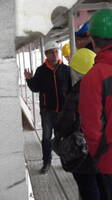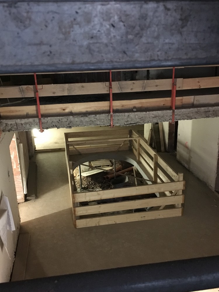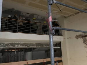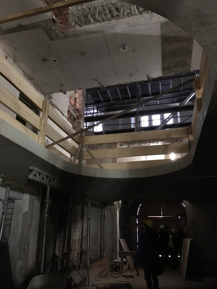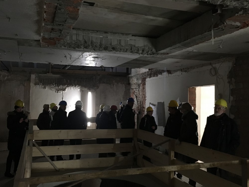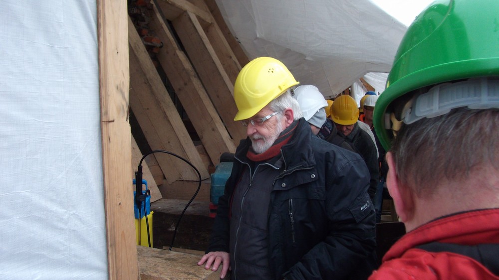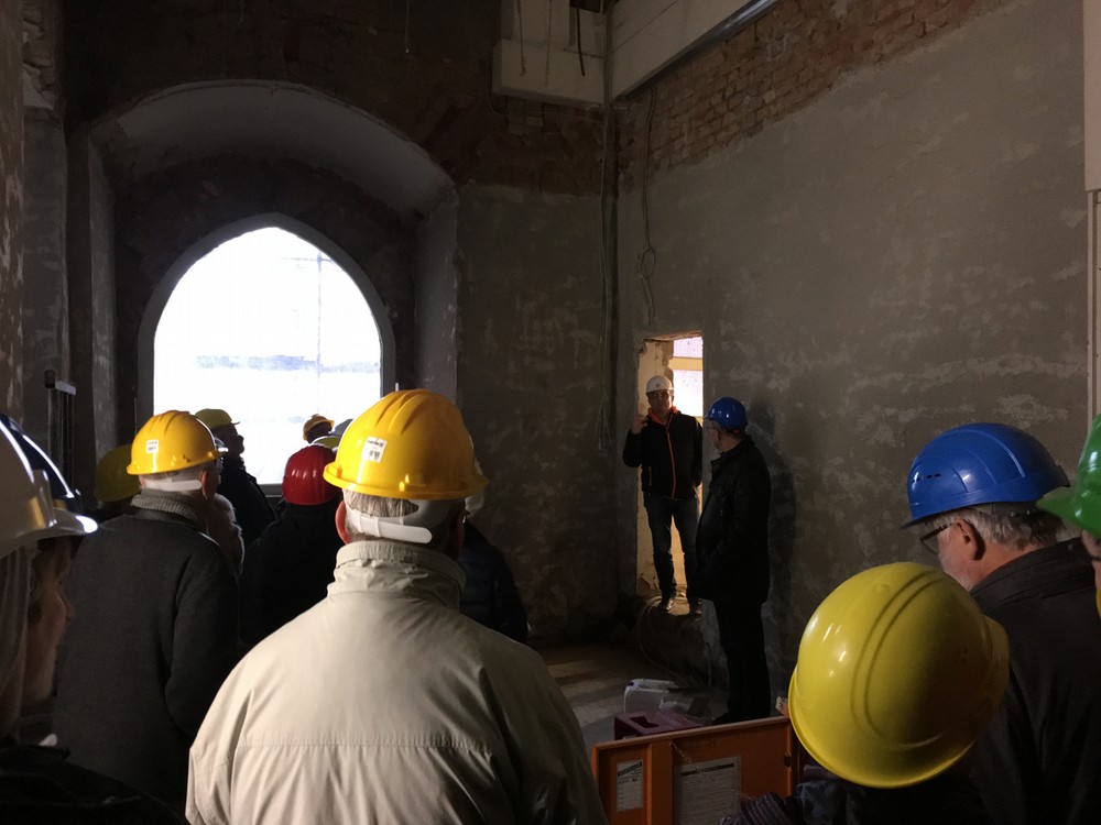 Aber bevor die Besichtigung beginnen konnte, wurden Arbeitsschutzhelme ausgegeben. Frau Köhler informierte uns zum Farbkonzept, was in dieser Woche beschlossen werden soll: Außenfassade in hell- und dunkelgrauen Tönen, für die Fenster ist ein Rotton geplant, umschrieben von Herrn Hertrampf „marmeladenrot“. Lassen wir uns überraschen.