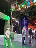 Auf der Bühne waren von der ersten Bühnen-Probe noch Teile der Ausstattung des neuen Balletts „Peer Gynt“ zu sehen. Die Erklärung der Technik (z. B. der Unterschied von Niedervolt- und Profischeinwerfern, Anschlussleistung, CO2-Bilanz, Traglast der Zugstangen) wurden abgerundet durch eine „Runde auf der Drehscheibe für alle!“. Interessant ist auch, dass neben ca. 4 Technikern immer auch viele andere Gewerke von Maske über Kostüm und Ankleider die Vorstellungen begleiten. Die Antwort auf die Frage nach der bisher schlimmsten Panne kam ohne zu zögern: Das war bei Faust, als durch ein heftiges Gewitter alles dunkel war und die Zuschauer das Gebäude verlassen mussten.