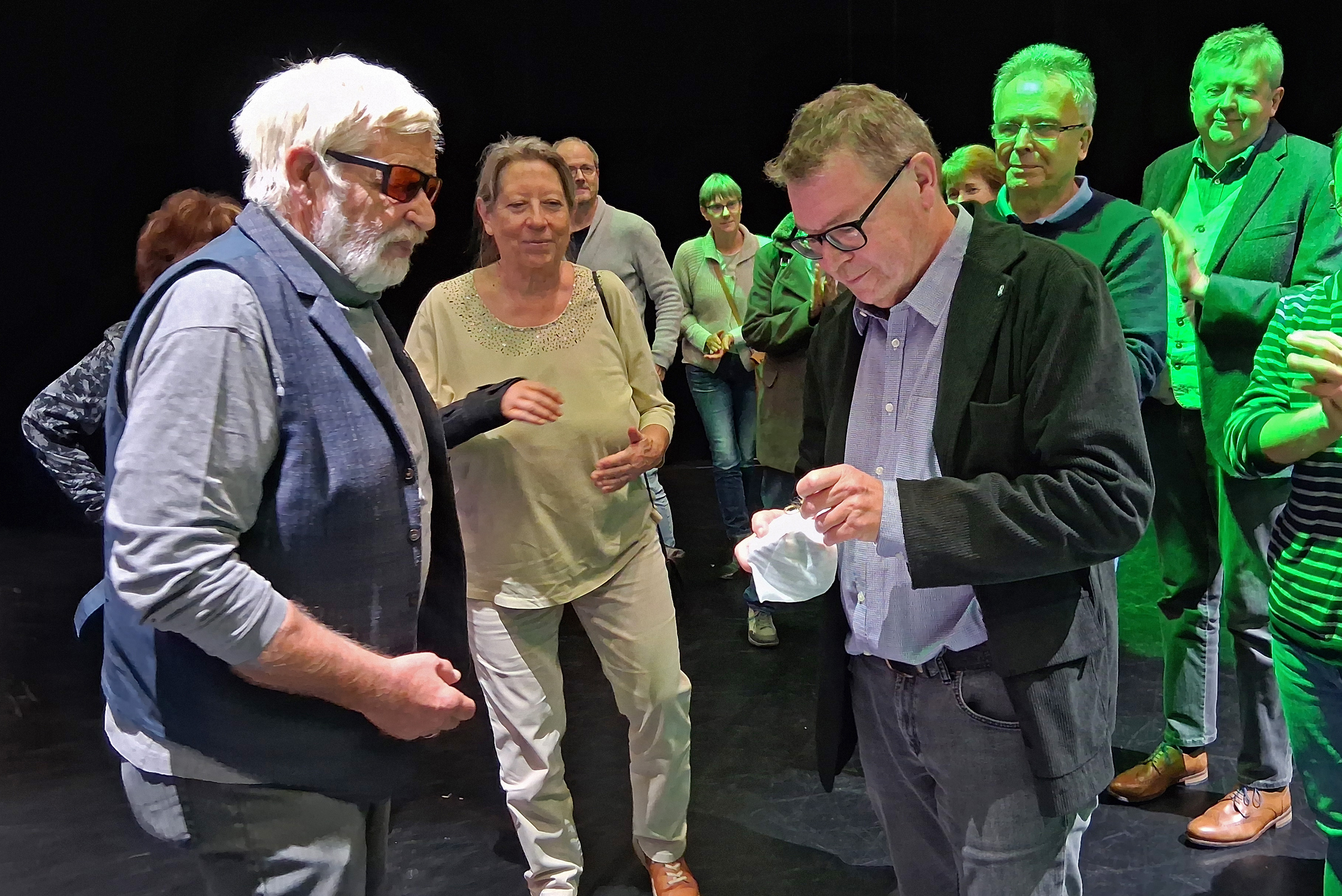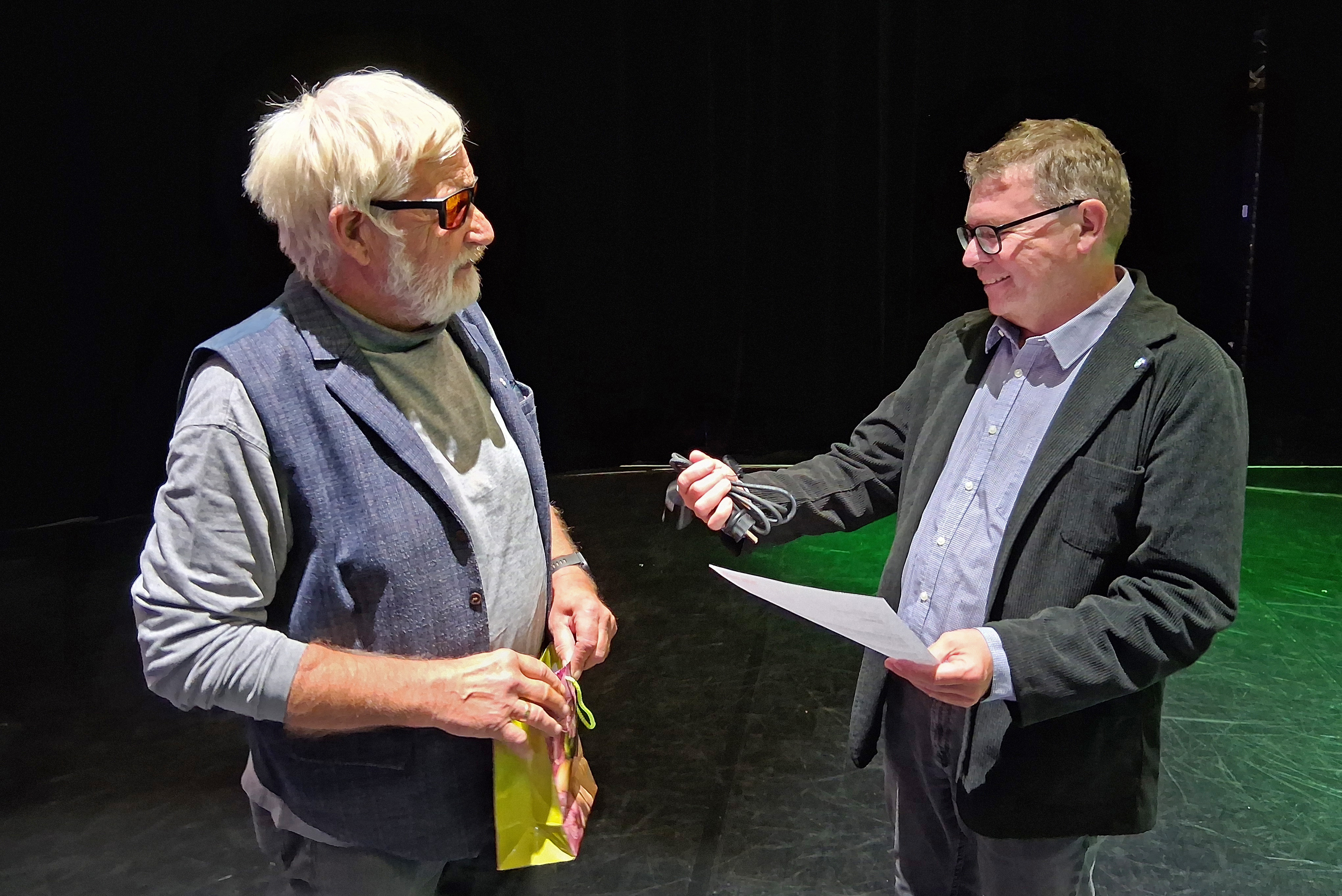 Im Anschluss übergab der Vorsitzende des Fördervereins, Herr Klüglich, an Herrn Gahs und seinen Mitarbeiter ein kleines Geschenk und eine Bestätigung über eine großzügige Spende des Vereins an das Theater für die lichttechnische Ausstattung des Hauptfoyers im Gewandhaus zur Nutzung als zusätzliche Spielstätte, die genau zur richtigen Zeit kommt und durch Herrn Gahs mit großer Freude und Dankbarkeit entgegengenommen wurde.