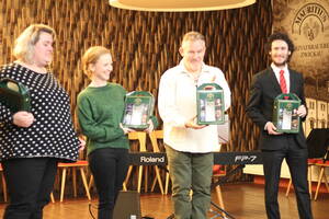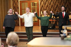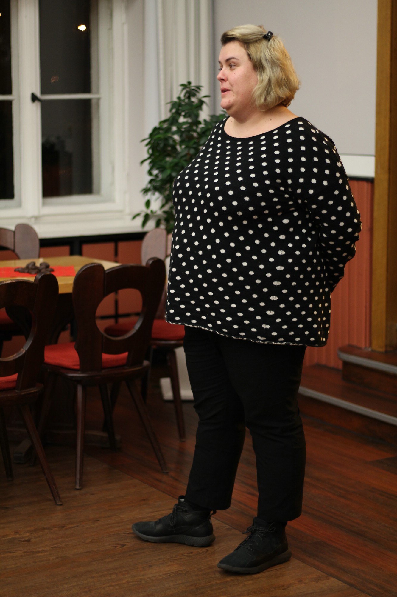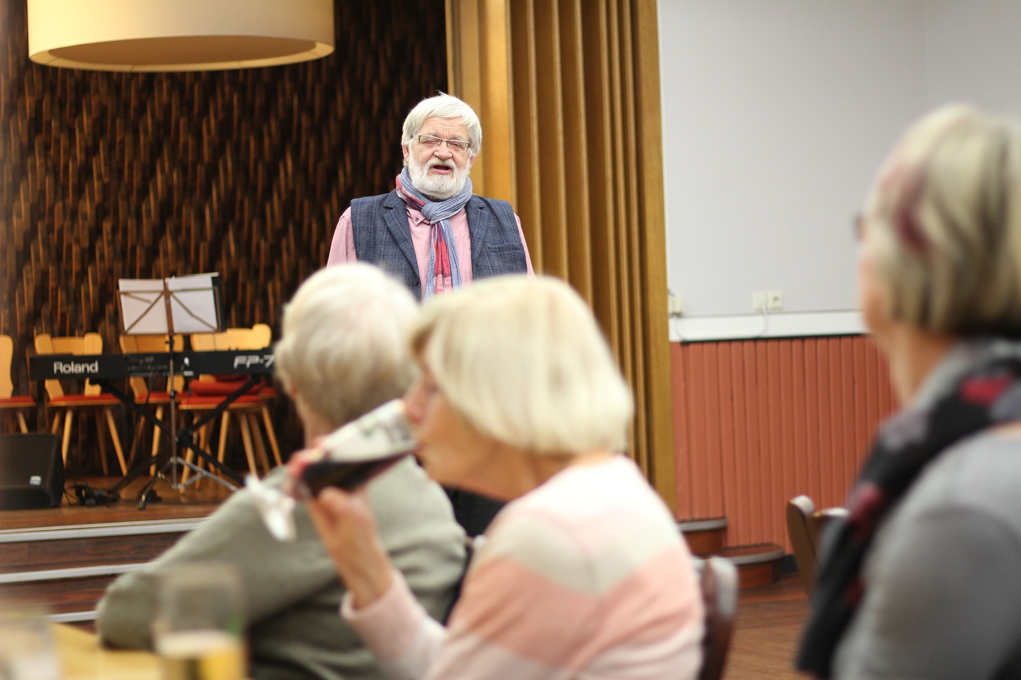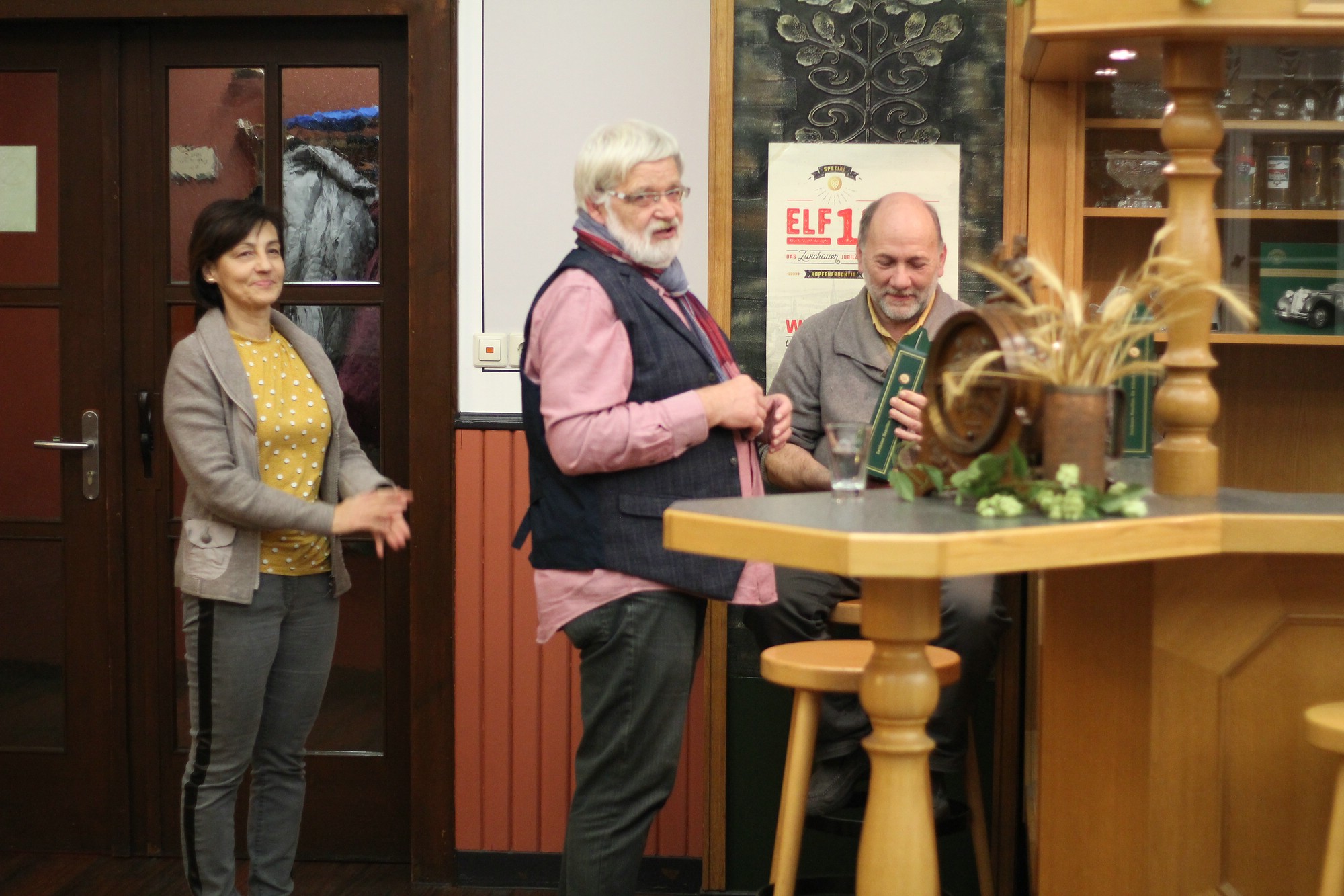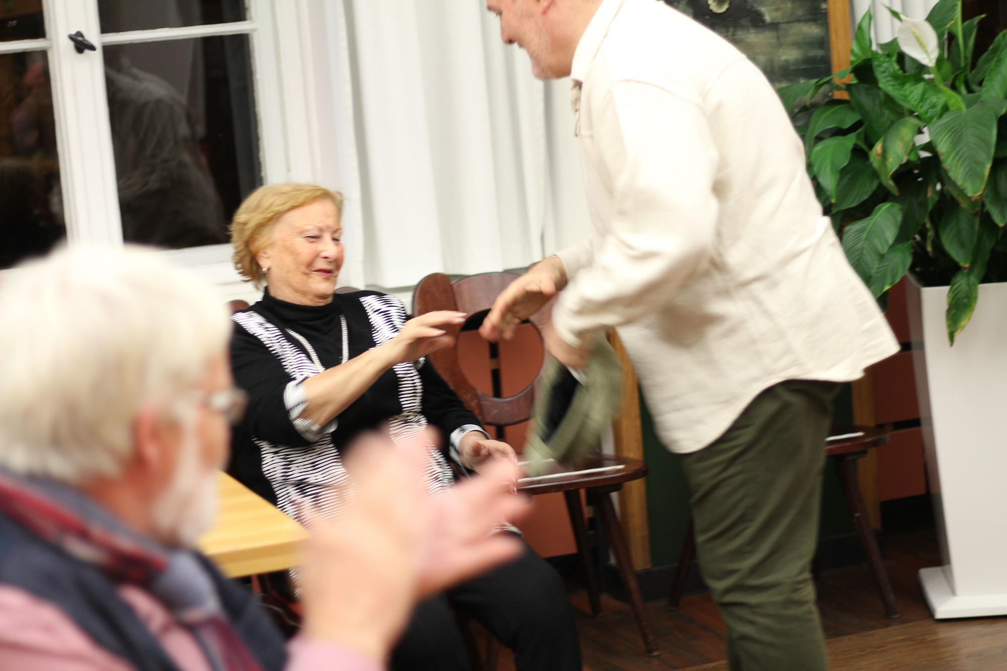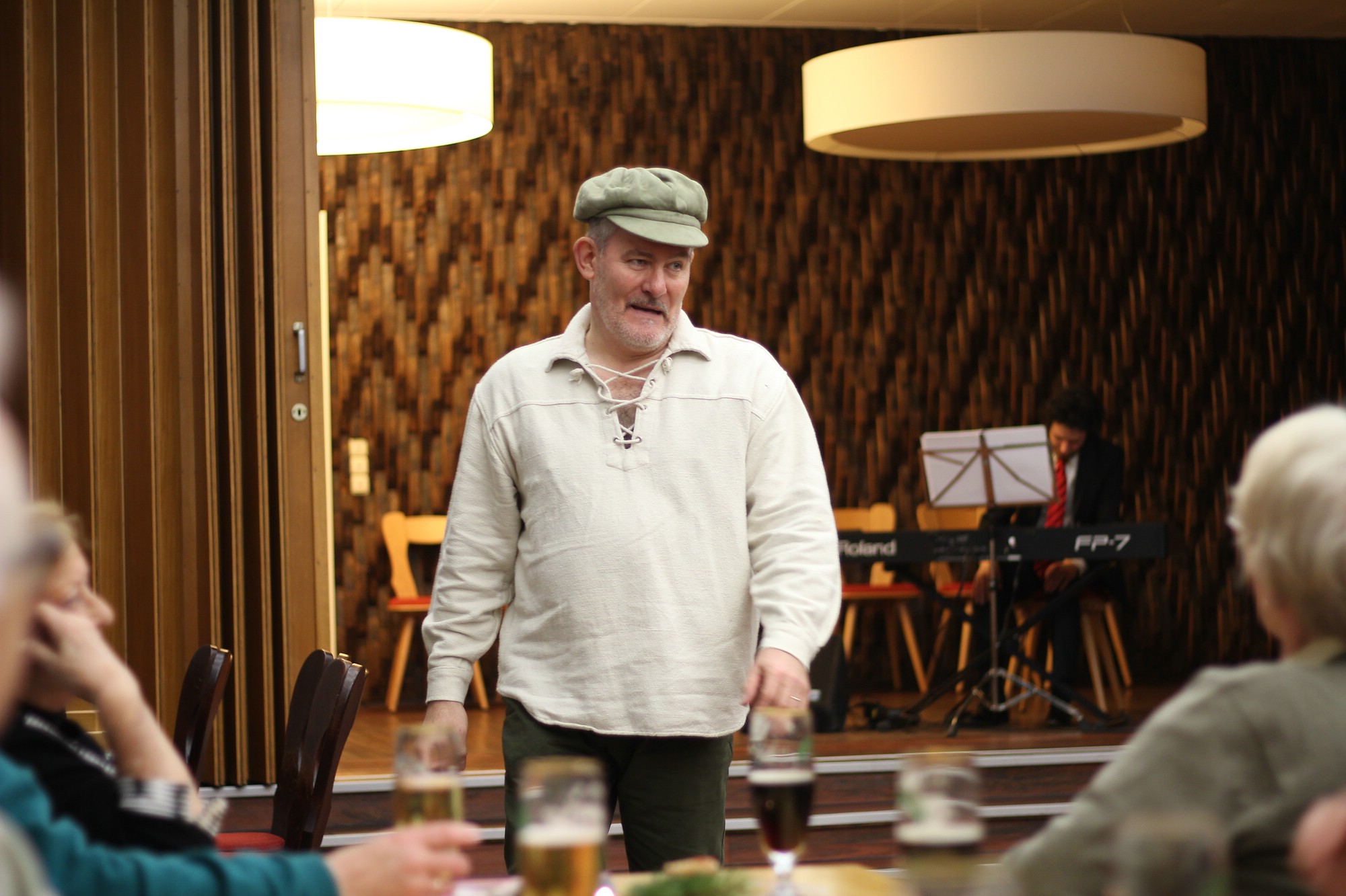 Im Dezemberstammtisch geht es immer weihnachtlich zu. Trotz Regenguss abends am 3. Dezember 2018, konnte man die Weihnachtsstimmung im Schalander der Mauritiusbrauerei spüren. Der Raum war weihnachtlich geschmückt und wer eine gute Nase hatte, konnte den Duft von Räucherkerzchen wahrnehmen. Unser Vorsitzender, Henry Klüglich, begrüßte die zahlreich erschienenen Gäste recht herzlich. Und, wie schon zu einer guten Tradition geworden, stimmten Künstler unseres Theaters musikalisch auf die Adventszeit ein. Maxi Ratzkowski, künstlerische Produktionsleiterin und leitende Dramaturgin Schauspeil am Theater, führte durch das Programm. Vom Milchmann aus “Anatevka“, gesungen von Frank Blees (Sänger, seit dieser Spielzeit im Ensemble), erfuhren wir, was er alles machen würde, wenn er einmal reich wäre. Spontan bekam der „arme Mann“ von einer Zuschauerin eine Kopfbedeckung. Schauspielerin Julia Hell schwärmte von ihrem himmelblauen Trabant, eine Kostprobe aus „Horch was kommt von Draußen rein“. Zum Abschluss konnten wir alle von einer weißen Weihnacht träumen. Vielleicht erfüllt sich der Traum. Musikalisch wurden die beiden Künstler von Mark Johnston, Solorepetitor und Dirigent, am E-Piano begleitet. Mit viel Applaus und einem kleinen Dankeschön wurden die Künstler verabschiedet. Ein Dankeschön ging stellvertretend auch an Horst Grunwald von der (Ton)Technik. Anschließend lud Henry Klüglich an das kalte Buffet. Danach war genügen Zeit, um Gespräche zu führen und um den Theaterliebling zu wählen.