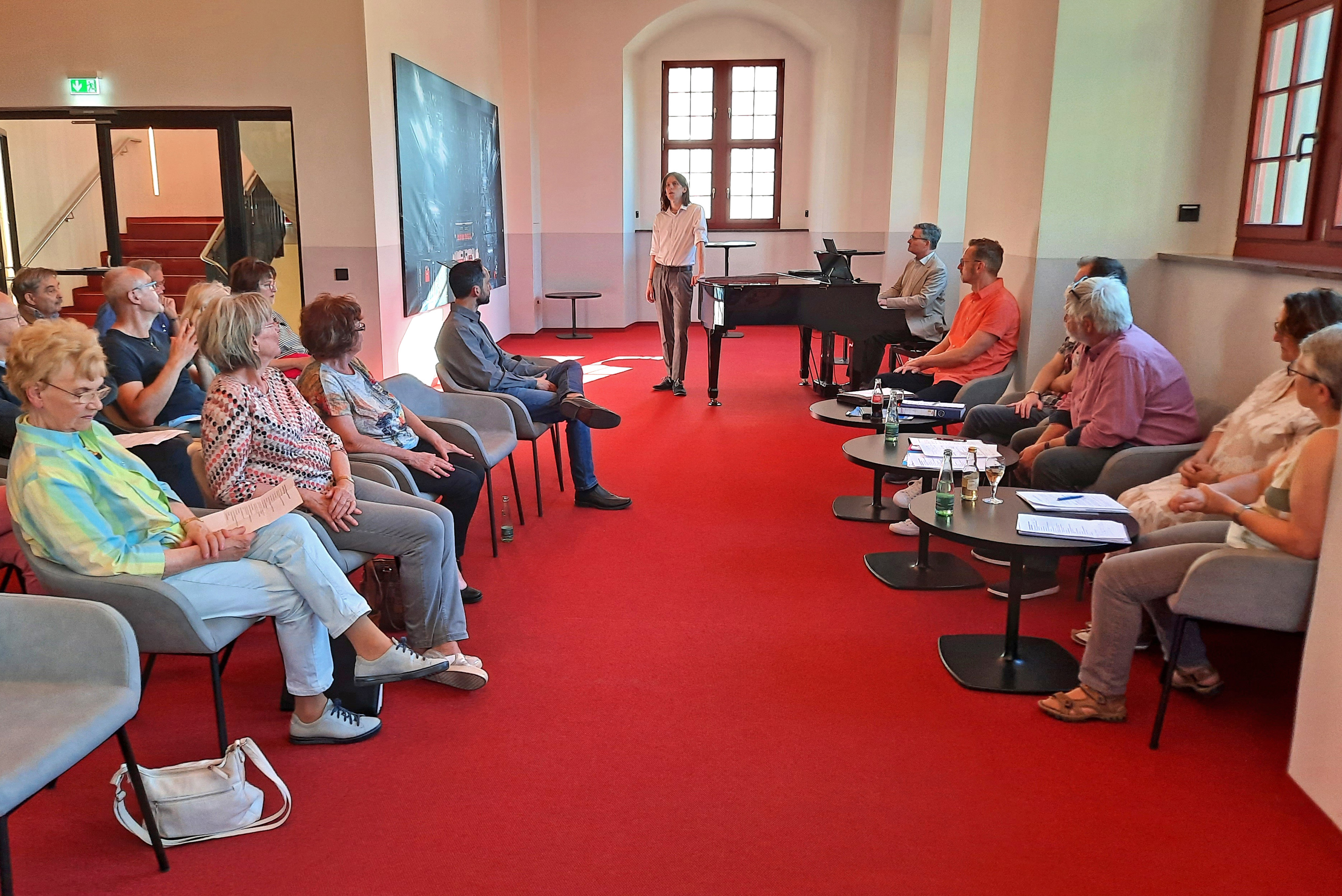 Gleich zu Beginn sorgten Vertreter des Musiktheaters für einen kulturvollen Leckerbissen. Matthias Spindler am Flügel und Arvid Fagerfjäll (der uns in der nächsten Spielzeit leider nicht mehr mit seiner tollen Stimme erfreuen wird), brachten ein kleines Programm - passend zum Motto der neuen Spielzeit "Was macht Macht?" - zu Gehör. Zu Beginn ging es um "Zins und Zinzeszins als Krone des Gewinns", weiter mit Brecht und Kurt Weill, einer Ultrakurz-Fassung der "Salome" (vorgetragen von Herrn Spindler), Franz Schubert und einem etwas abgewandelten "Vater unser". Unter herzlichem Applaus wurden die Künstler verabschiedet. Über ein kleines Präsent als Dankeschön haben sich beide sehr gefreut.