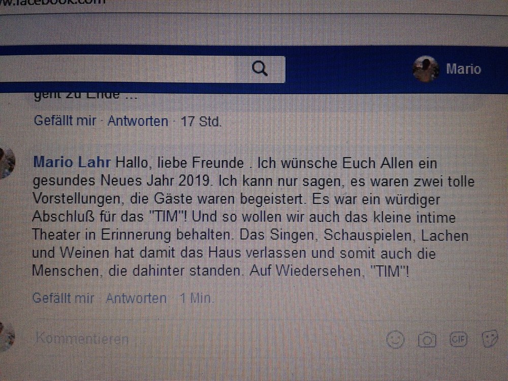 Unter den vielen Gästen der ausverkauften Vorstellung waren (natürlich) auch fast alle Mitglieder des Vorstandes und weitere Mitglieder unseres Theaterfördervereines "Caroline Neuber", die sich diesen endgültigen Abschluß nicht entgehen lassen wollten. Beschwingt, aber auch mit Wehmut haben wir uns vom alten Jahr und unserem TiM verabschiedet. Wir hoffen, dass die Suche nach einem möglichst gleichwertigen Ersatz bald von Erfolg gekrönt sein wird. Bis dahin werden die Besucher den Theaterleuten in die verschiedenen Ausweichspielstätten folgen und dort spannende Inszenierungen sehen.