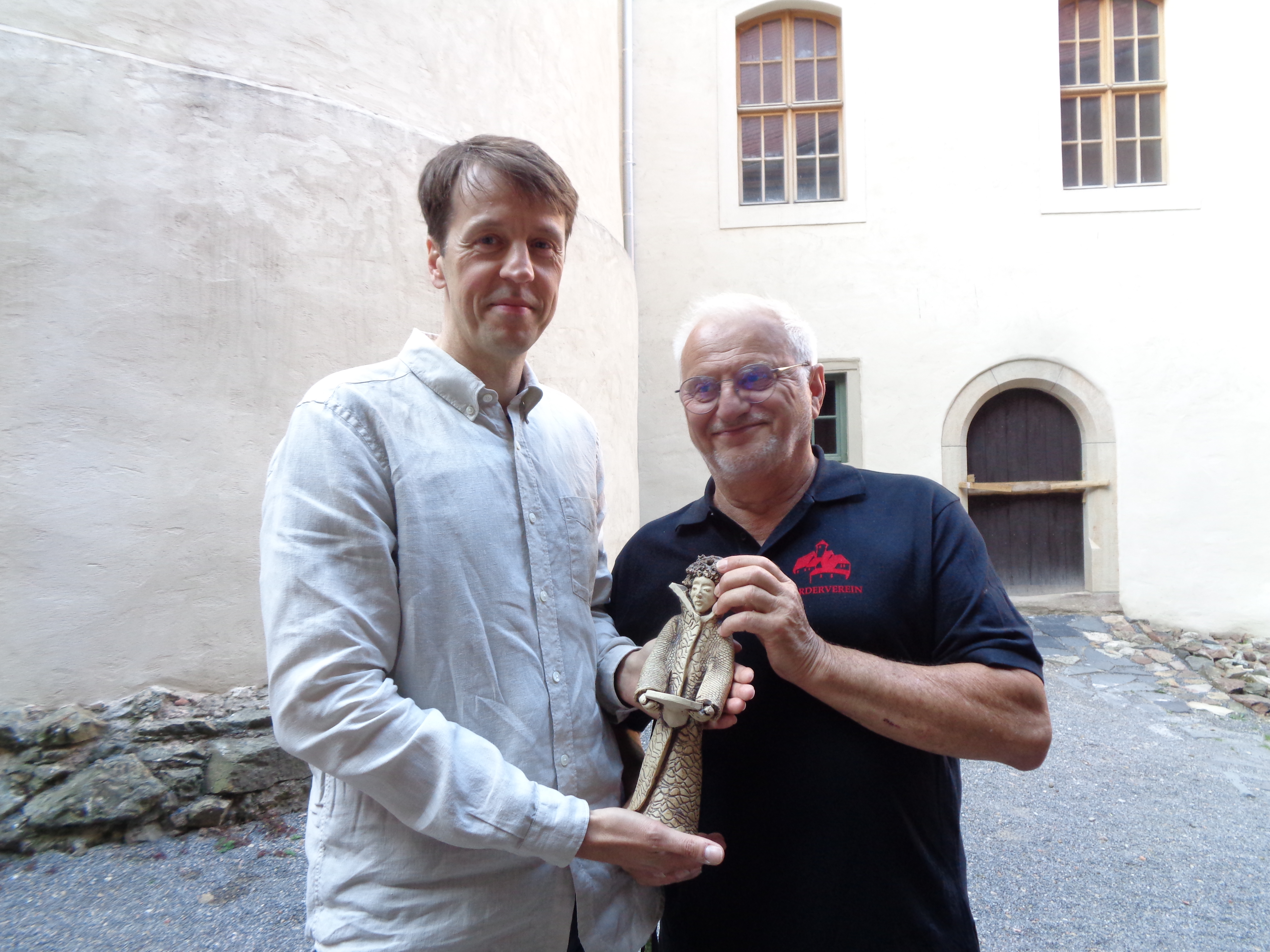 Im Vorfeld hatten wir noch die Gelegenheit, kurz mit dem Förderverein der Burg Gedanken und Erfahrungen auszutauschen. Bei der Gelegenheit übergab unser Vorsitzender, Herr Klüglich, eine Figur aus der Lukaswerkstatt an den Vereinsvorsitzenden und den Geschäftsführer des Fördervereins Burg Schönfels e.V. Auf dem Foto sind (links) der Geschäftsführer, Herr Wagner, und (rechts) Herr Rudert, Mitglied des Vorstandes, zu sehen. Vielleicht der Beginn einer langfristigen Zusammenarbeit?