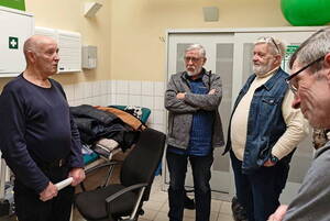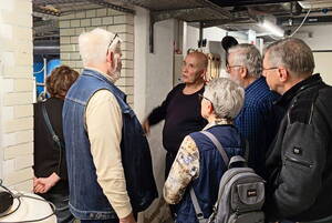 Viele kleine Episoden hörten wir auf der Runde, die uns auch in die unterirdischen Räume mit der modernen Wasseraufbereitungstechnik führte. Schade, dass der Hubboden auf Grund von Lieferschwierigkeiten derzeit nicht funktioniert, aber vom Spaß, den das Schwimmen in dieser tollen Halle macht, konnten wir uns überzeugen (als geduldete Zuschauer bei einer Therapiegruppe). Ein kleiner Blick in die Sauna rundete die Führung ab, und am Schluss stand für alle fest: