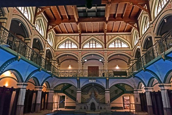 Der mit 89 (!) Jahren älteste Schwimmmeister Deutschlands, Herr Langner, führte uns in zwei kleinen Gruppen durch "sein Reich": das Johannisbad in Zwickau. Vielen Zwickauern ist die ursprünglich von Dr. Samuel Schlobig 1869 eröffnete Bade- und Heilanstalt, die nach einem Erweiterungsbau 1904 als Johannisbad eingeweiht wurde, aus der Kinderzeit bekannt. In der Halle haben viele Generationen von Zwickauer Kindern das Schwimmen gelernt. Kaum zu glauben, dass im Jahr 1991 der Komplex wegen Baufälligkeit geschlossen werden musste. Nach der umfangreichen Sanierung strahlt der Bau nun wieder in altem Glanz, die im Jugendstil gehaltene Innenausstattung mit einem Hauch orientalischer Badekultur bringt die Gäste aus ganz Deutschland und darüber hinaus seither zum Schwärmen. Auch als Filmkulisse für Hollywood hat das Gebäude schon gedient!