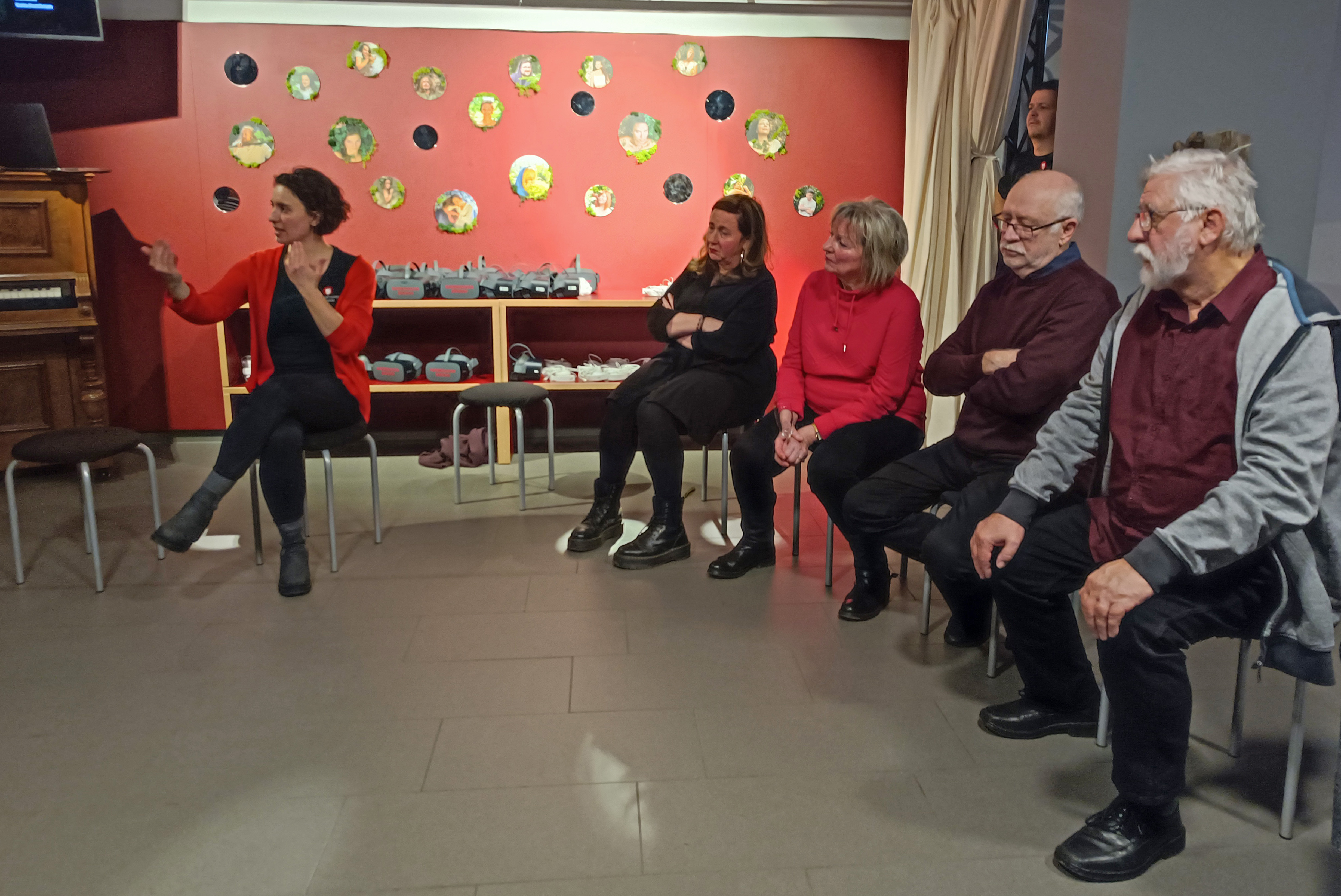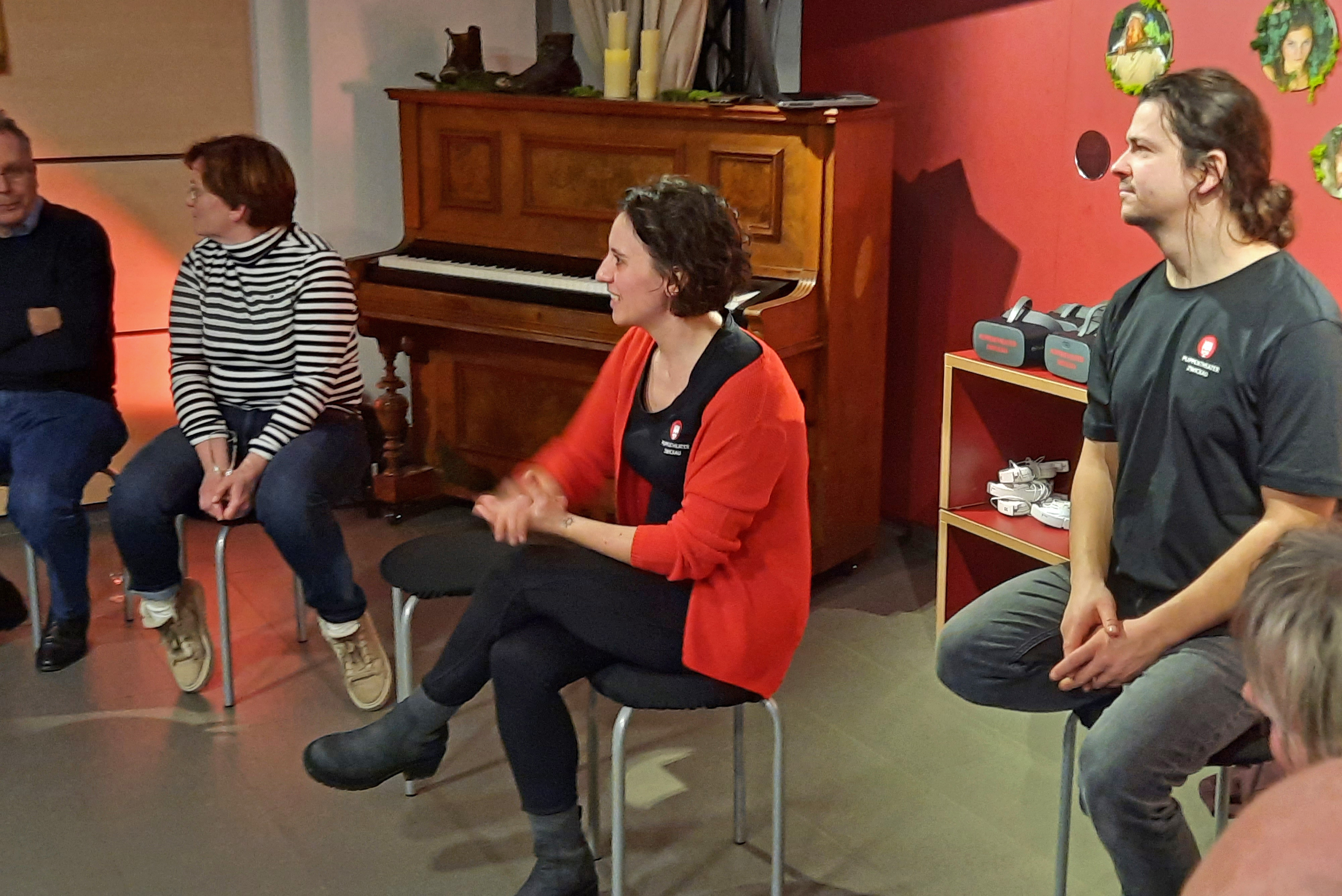 Nachdem jeder zu Ende geschaut hatte, hat uns Dominique Suhr bei einem Glas Sekt bzw. Orangensaft nochmals sehr viele, ausführliche Informationen zur Entstehung des Stücks gegeben. Viele technische Probleme mussten gemeistert werden, die Zusammenarbeit mit der Zwickauer Hochschule brachte beiden Partnern viel Erkenntnisgewinn. Welches System hat sich schon bewährt, wo kriegt man die Brillen her…?