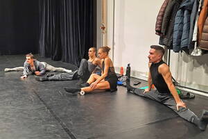 Wir waren zu Gast auf einer Probe des Balletts. Als wir die Probebühne betraten, waren schon vier Tänzer bei der Arbeit. Sie machten sich an der Ballettstange warm, jeder für sich und gemeinsam mit Unterstützung der Assistentin, Ballettmeisterin und Choreografin Wen-Hua Chang sowie des Ballettrepetitors und Pianisten Masayuki Carvalho. Da die Ballett-Compagnie eine ganz internationale Truppe ist, ist die „Amtssprache“ englisch, verziert mit einigen französischen Fachbegriffen. Langsam kamen die Tänzer ins Schwitzen und entledigten sich ihrer Jacken und Überhosen. Immer wieder machten sie zwischendurch Dehnübungen, bei denen schon vom Zuschauen alles weh tut.