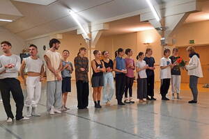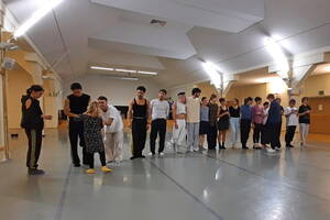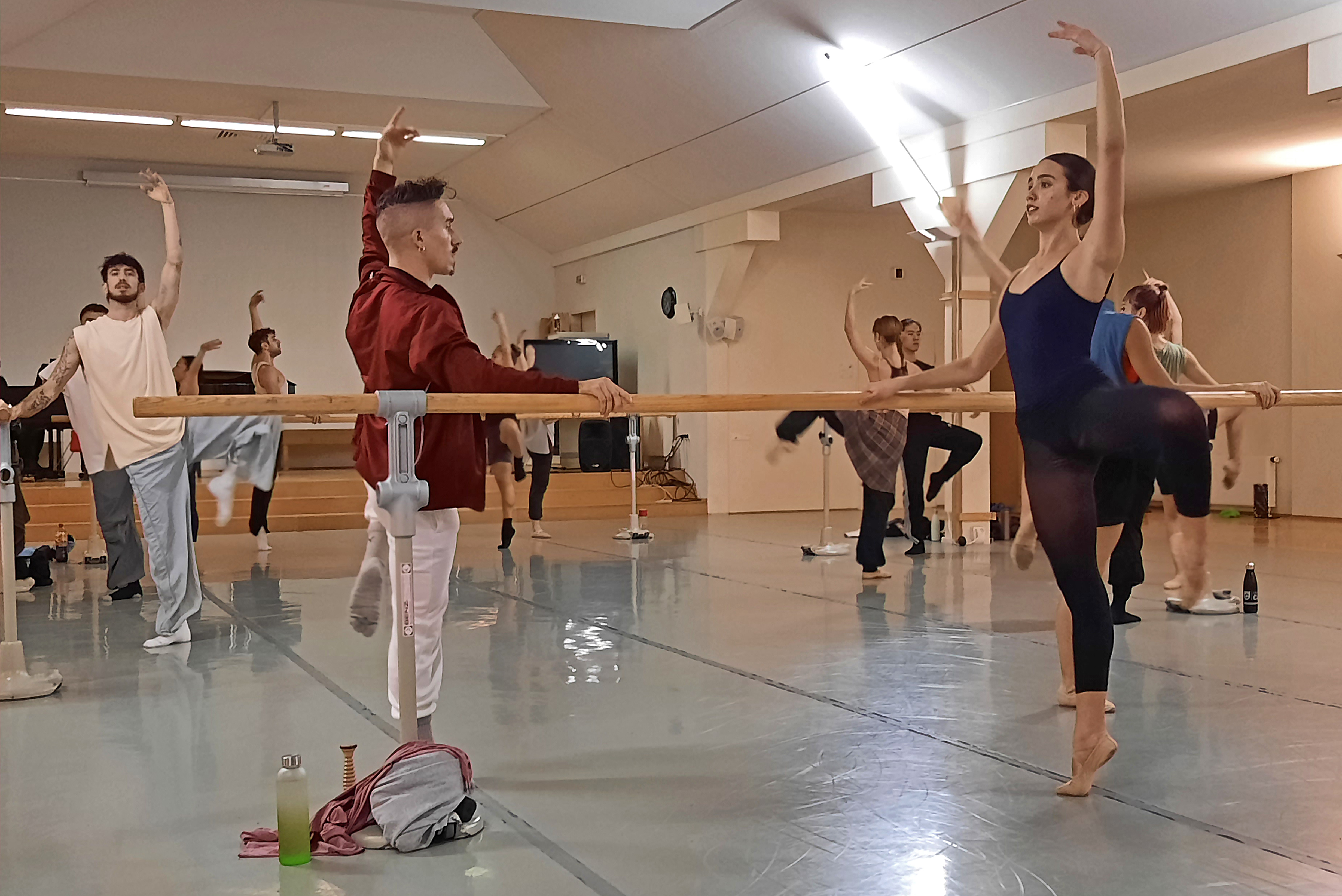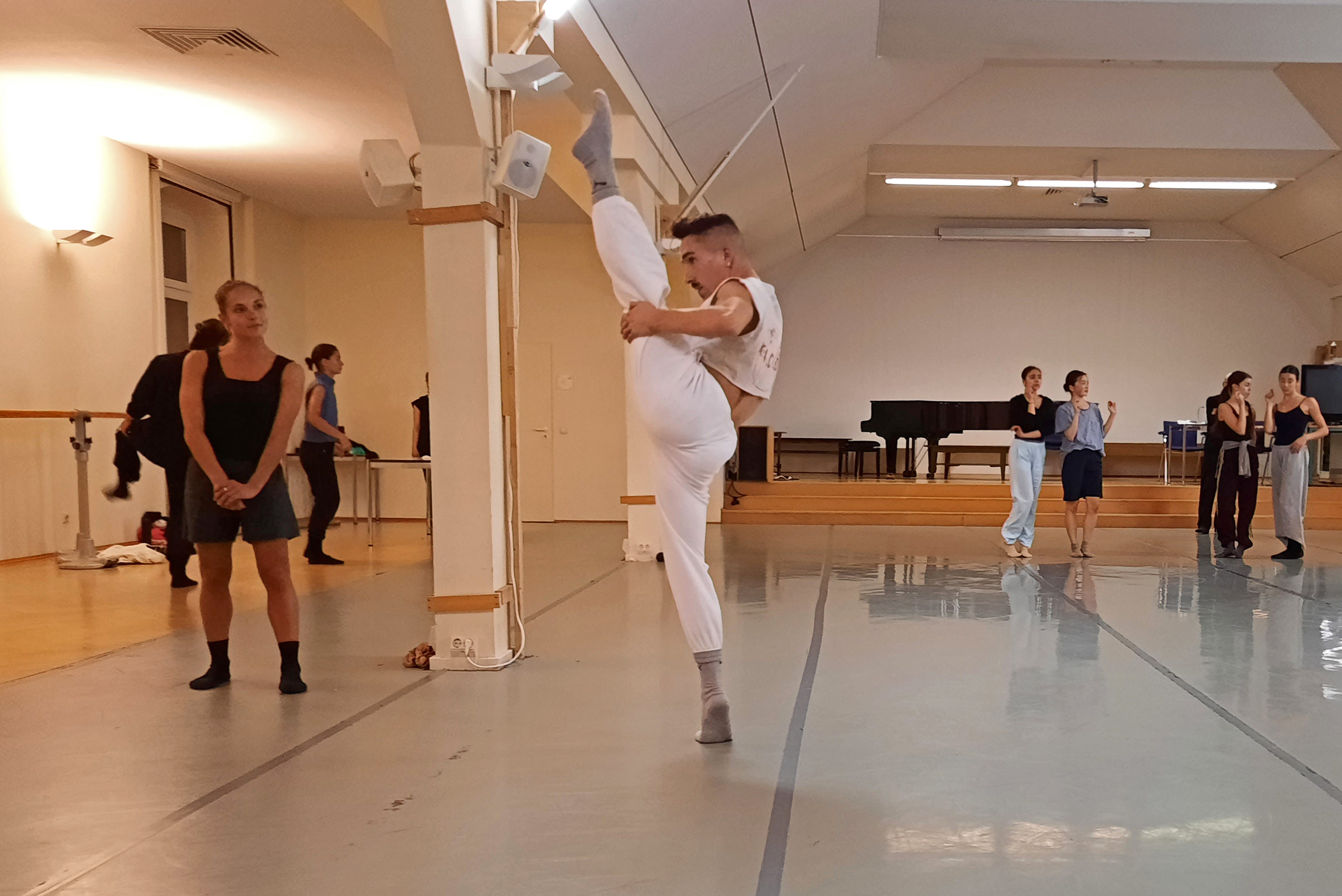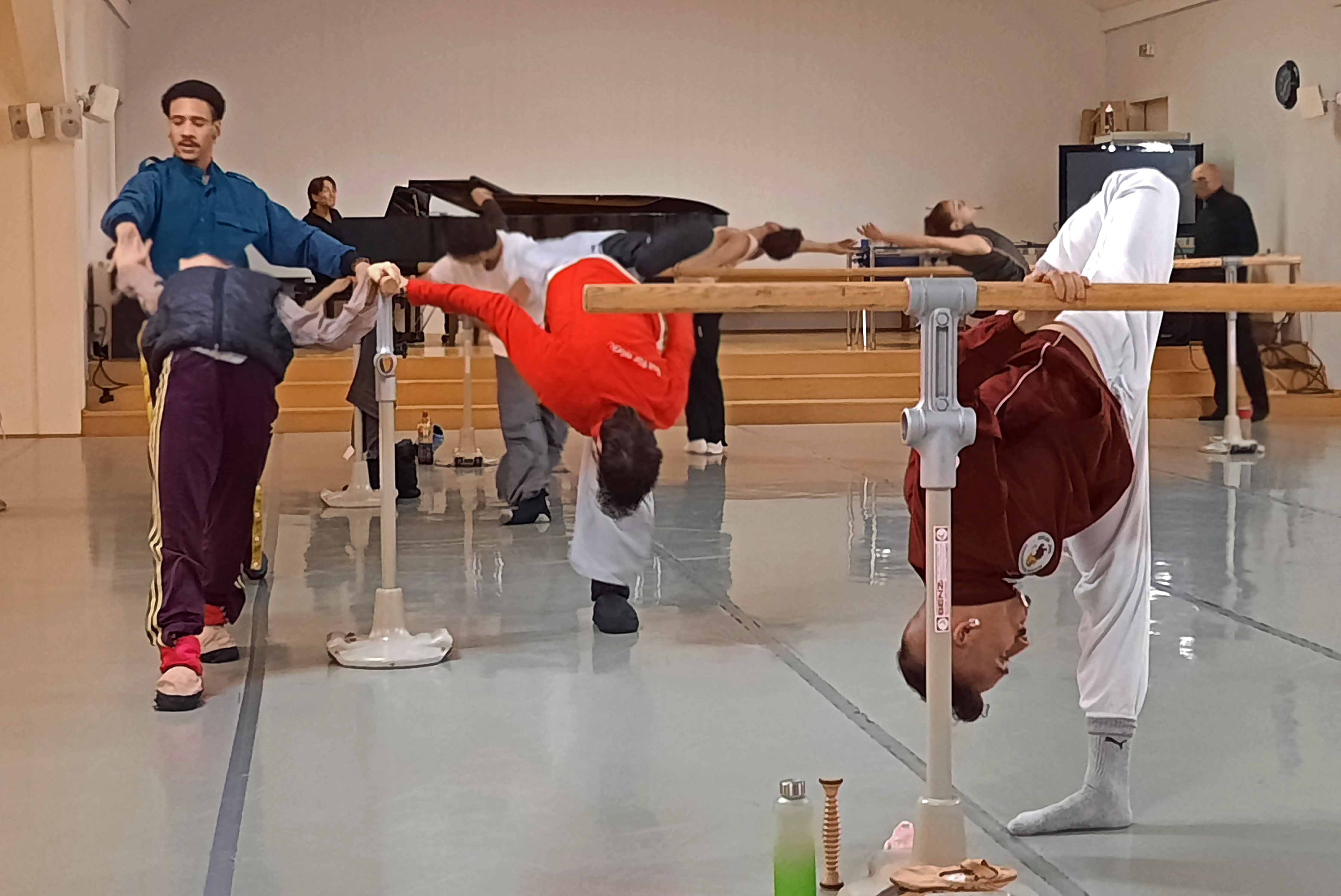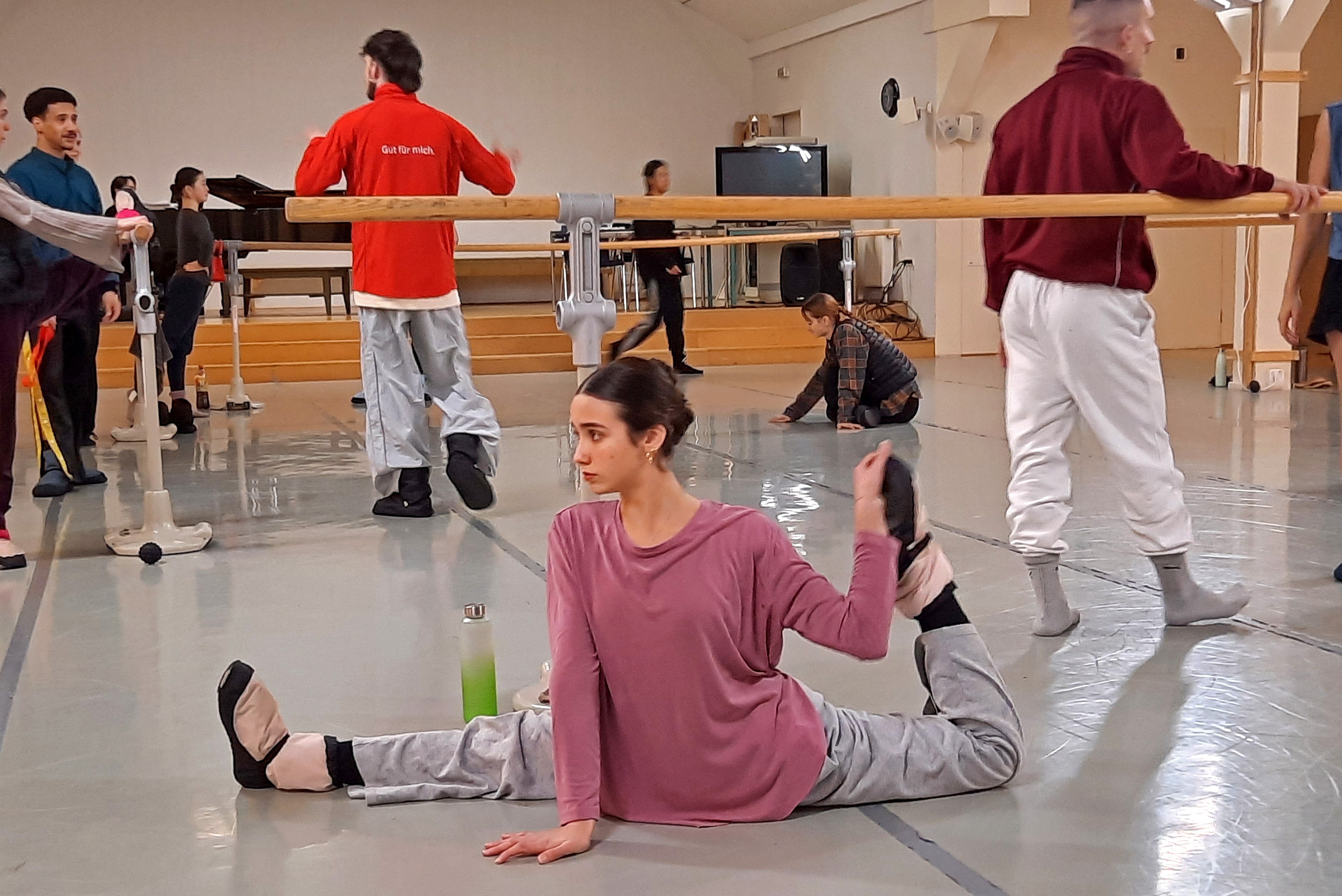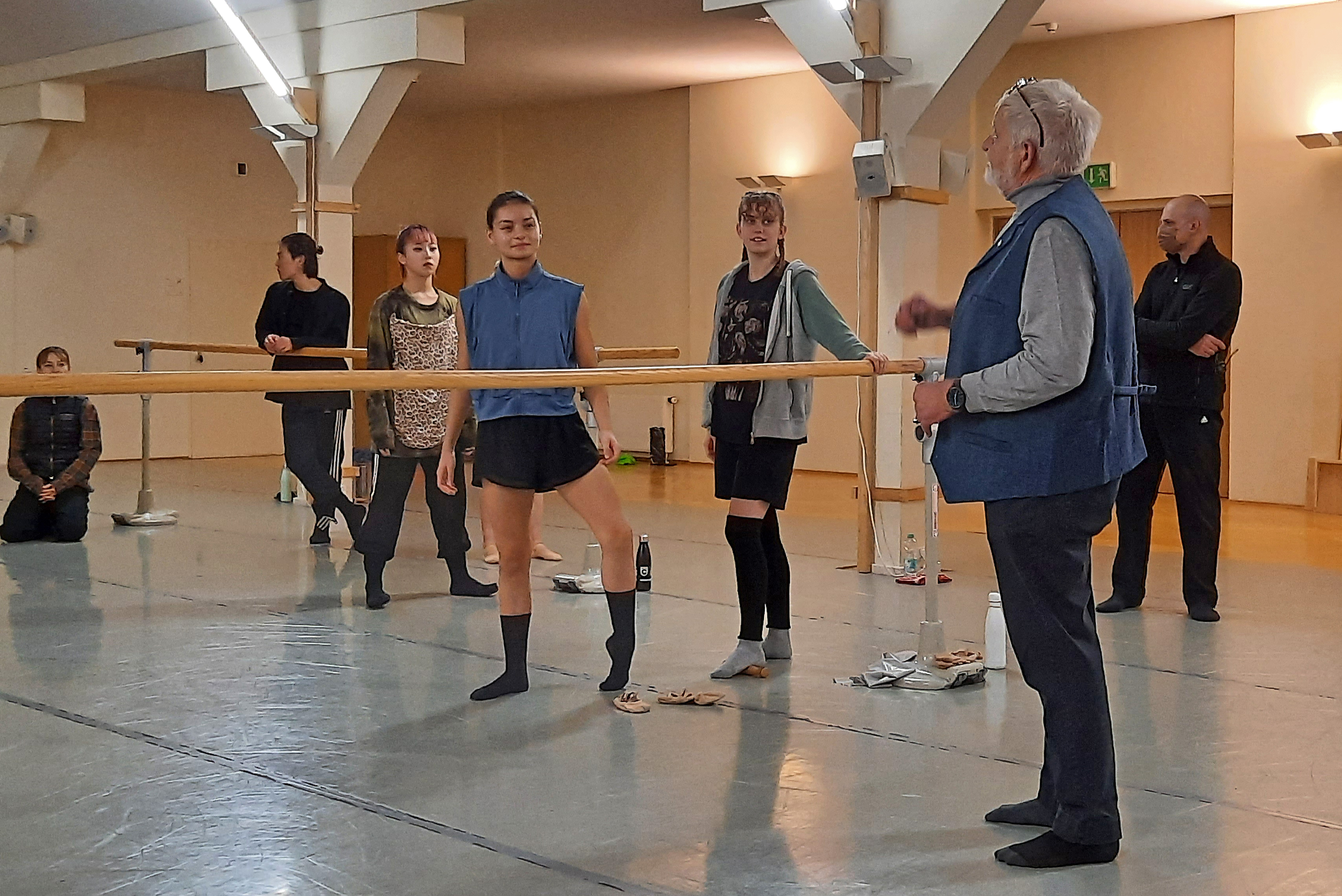 Nach der Begrüßung durch den Ballettdirektor Sergei Vanaev begann das gemeinsame Warm Up. Begleitet vom Ballett-Repetitor Masayuki Carvalho am Flügel machte der Ballettchef konkrete Ansagen, nach denen sich die 11 Tänzerinnen und 6 Tänzer an den Ballettstangen bewegten. Da die Mitglieder der Kompanie aus verschiedenen Ländern kommen, u. a. Japan, China, Korea, Brasilien, Finnland, Italien, wird im Ensemble Englisch gesprochen. Ich weiß nicht, ob mein Englisch nicht ausreichte oder ob die verwendeten Begriffe doch etwas spezifisch sind – ich jedenfalls habe bis auf eine einige französische Einsprengsel, z. B. „Plie“, nichts verstanden. Bei den Tänzerinnen und Tänzern funktionierten die Ansagen, sie bewegten sich zur Musik. Erste Schweißperlen wurden sichtbar und immer mehr Garderobenteile wurden abgelegt.