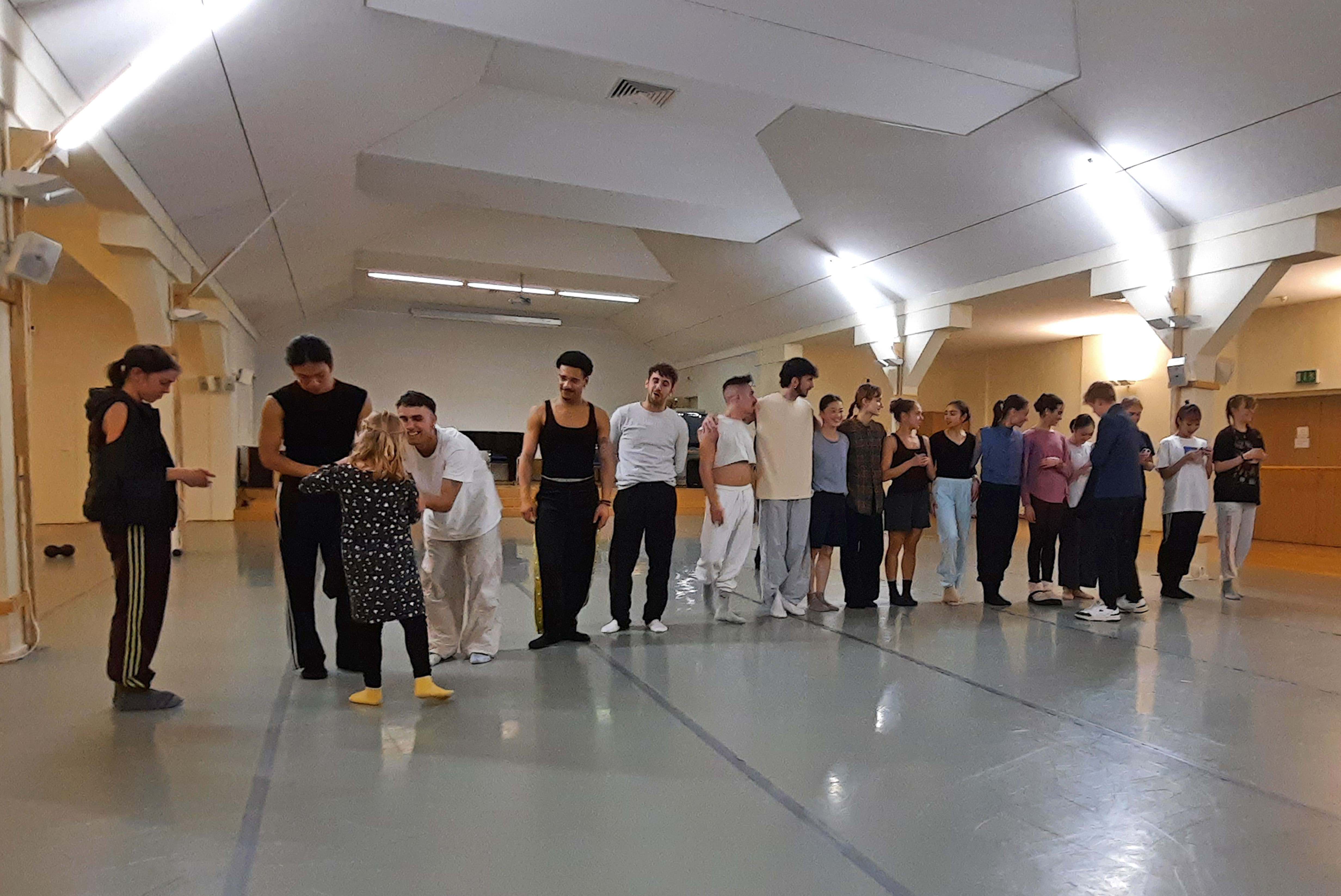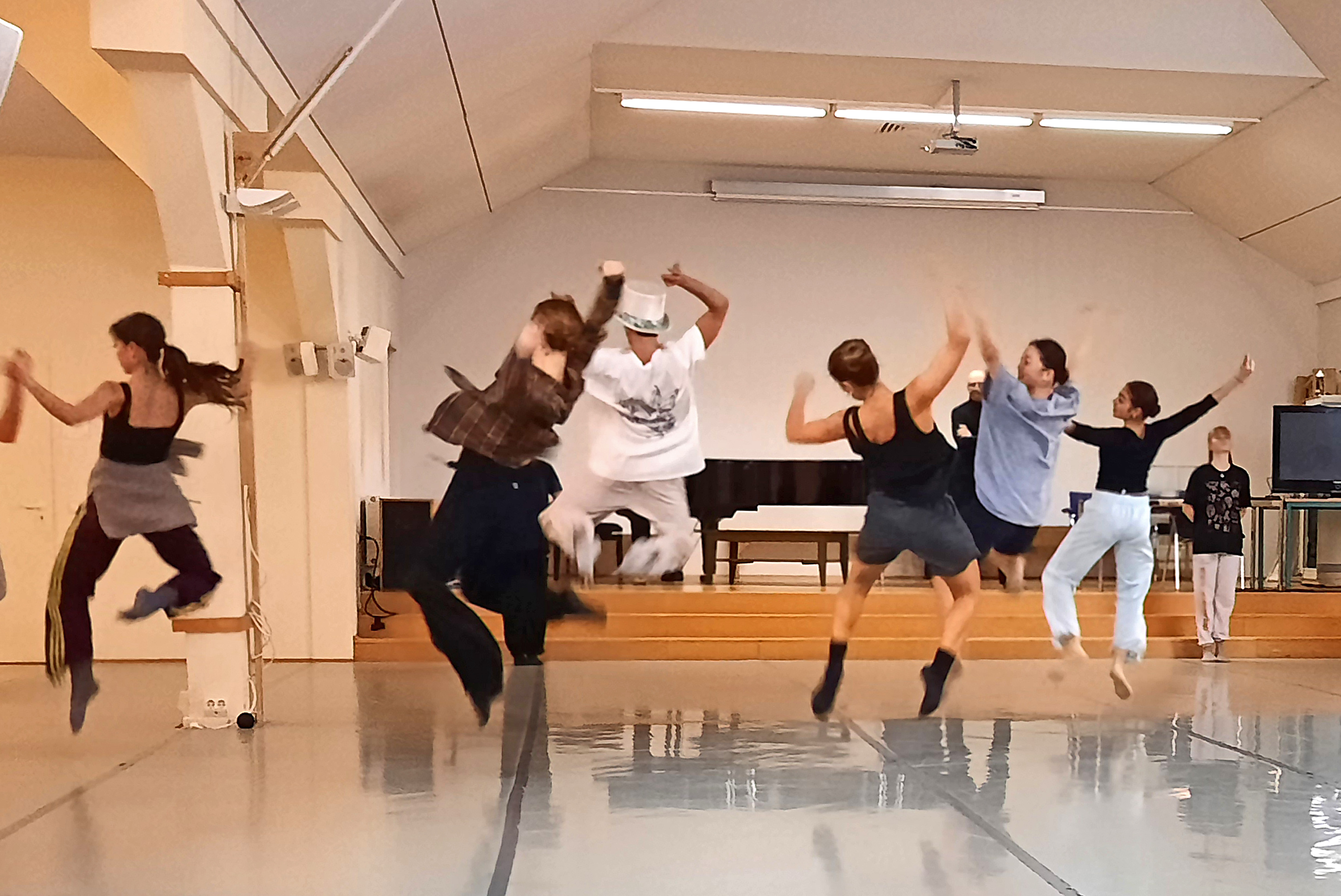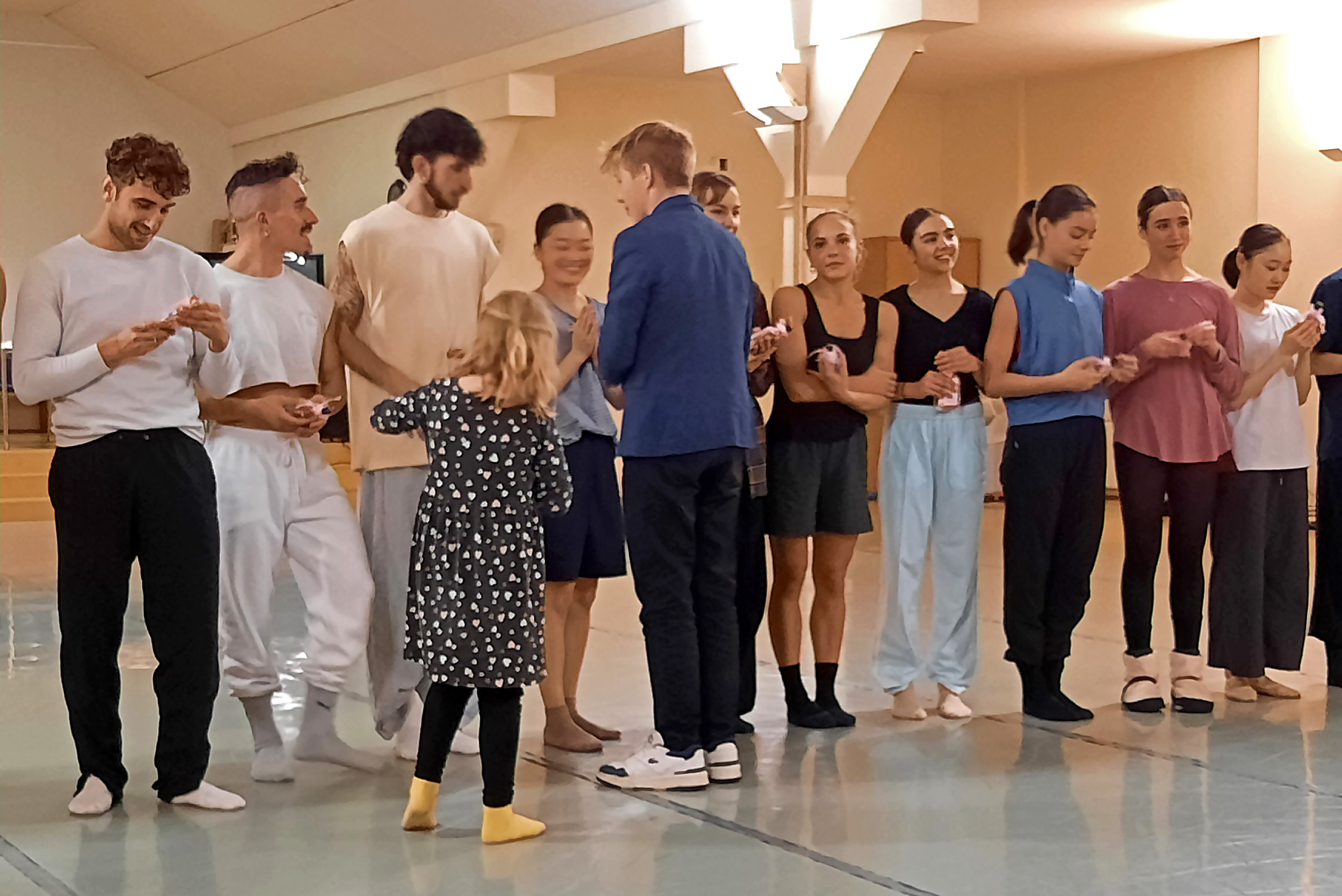 Für uns gab es nun erste Einblicke in Szenen des Balletts. Immer wieder wechselten die Beteiligten. Interessant war, dass Doppelbesetzungen am Rand der „Bühne“ immer mittanzten. Was ich so auch nicht erwartet hätte, war die große Aufmerksamkeit gegenüber den KollegInnen von Seiten der gerade nicht tanzenden Ballett-Mitglieder. Sie sparten nicht mit Beifall, den es auch reichlich von uns Gästen gab.