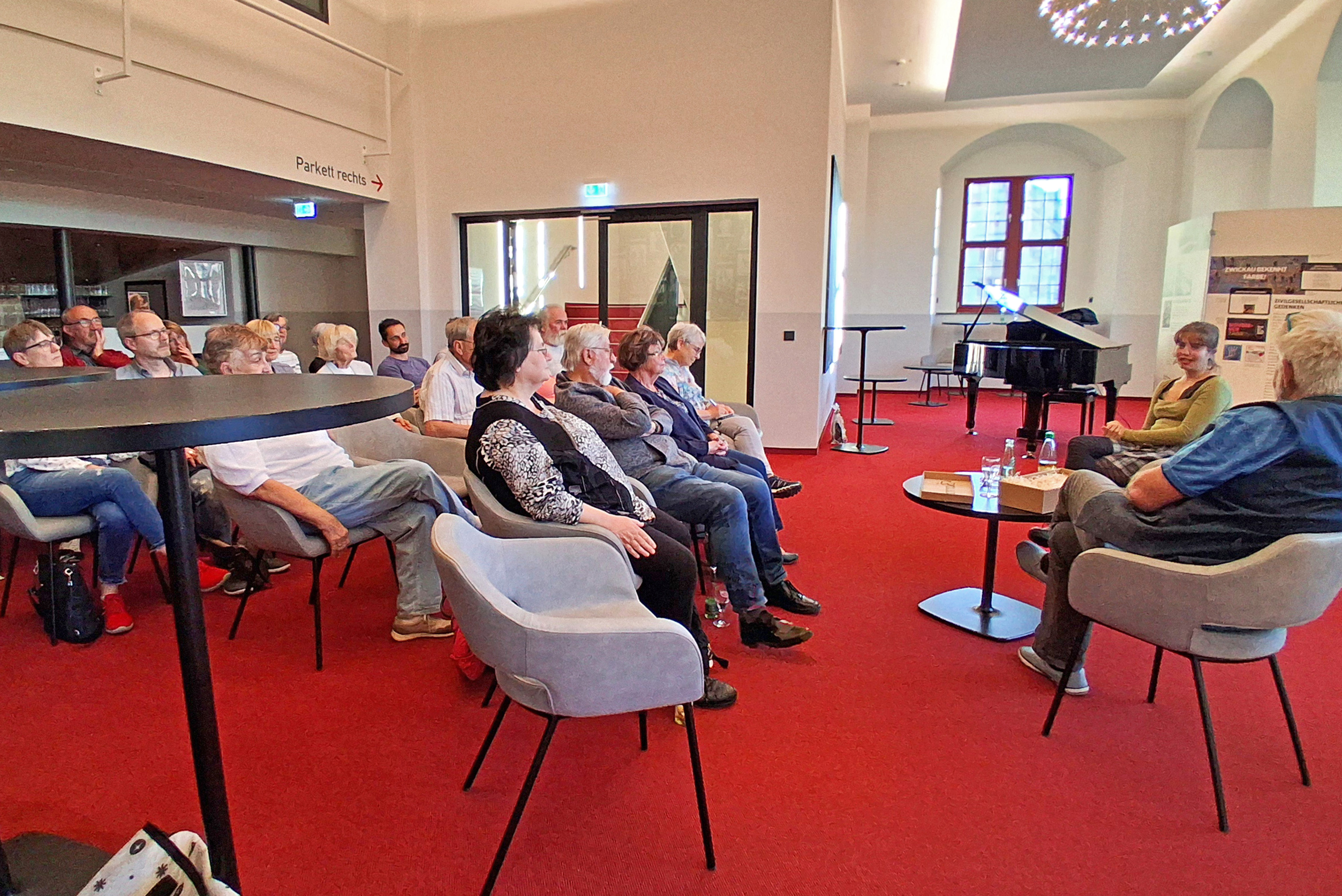 Mit einem musikalischen Leckerbissen begann der Stammtisch: Frau Birgmeier, unterstützt durch Dionysios Pantis am Stutzflügel, sang für uns eine Arie der Musetta aus „La Bohème“ von Puccini und danach ein Jazz-Arrangement von Aerosmith: „Dream on“. Schon mit dieser kurzen Kostprobe begeisterte sie uns Zuschauer und bewies, welch riesigen Stimmumfang sie hat (der geht sogar bis C4).