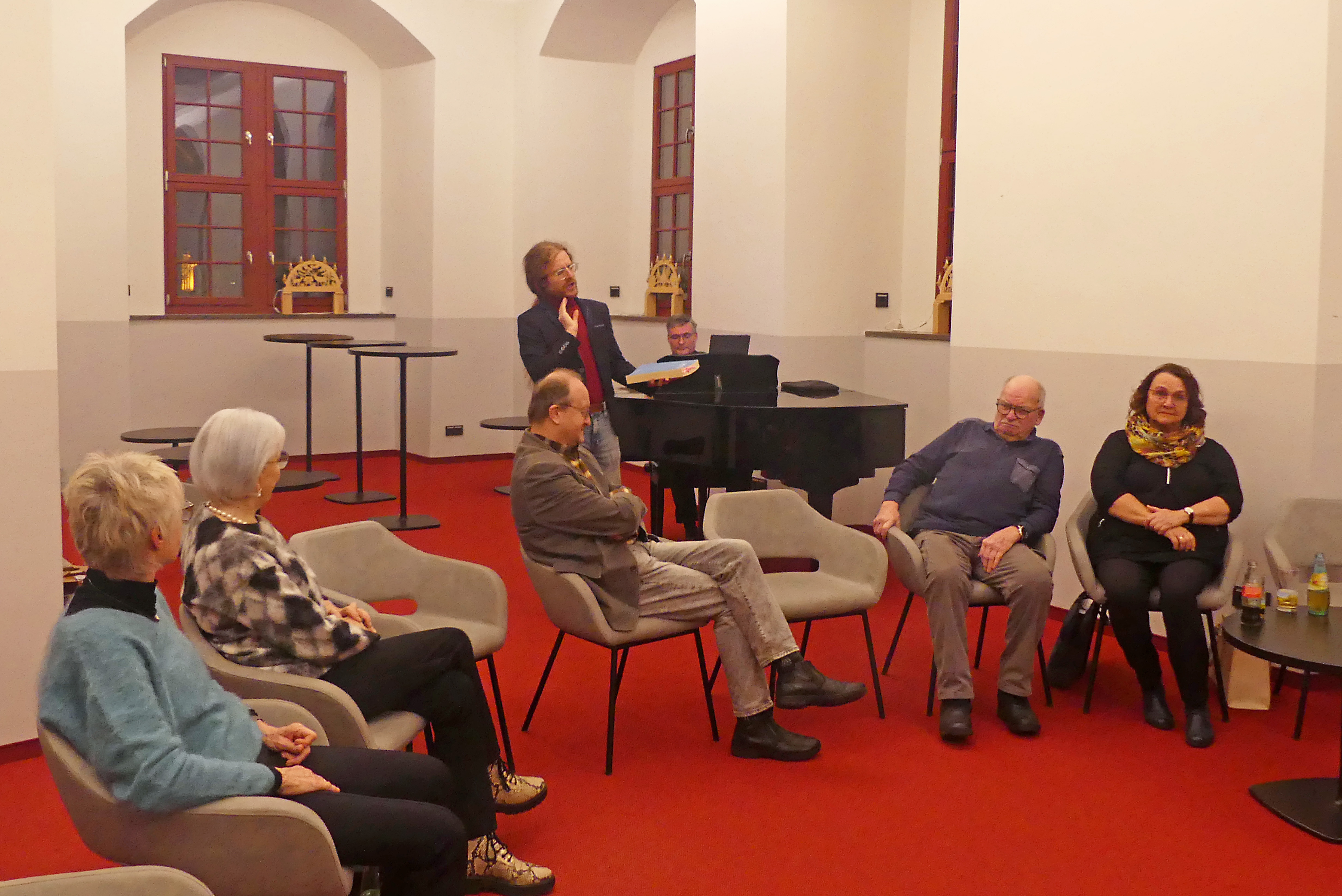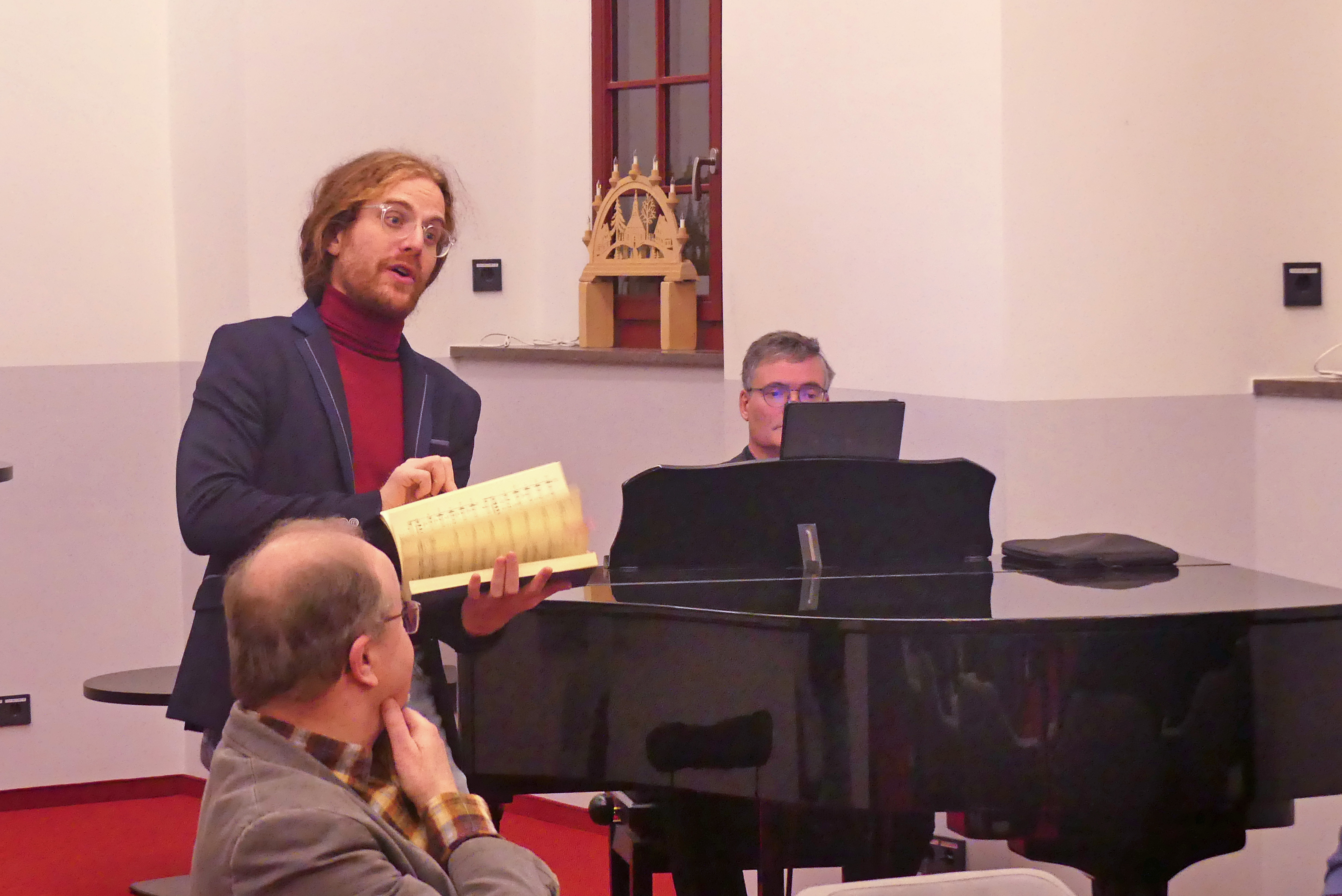 Der Gast unseres Februar-Stammtisches, der amerikanische Bariton Gabriel Wernick, hat bereits zur letzten Jahreshauptversammlung unser Herz erobert und begrüßte uns mit einem Lied von Brahms. Danach hörten wir noch die Registerarie aus „Don Giovanni“. Begleitet wurde er, wie schon traditionell, von Mattias Spindler am Klavier.