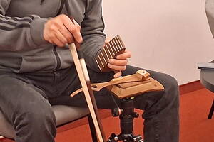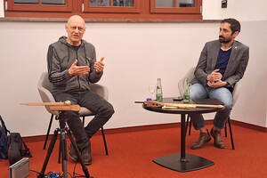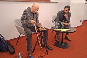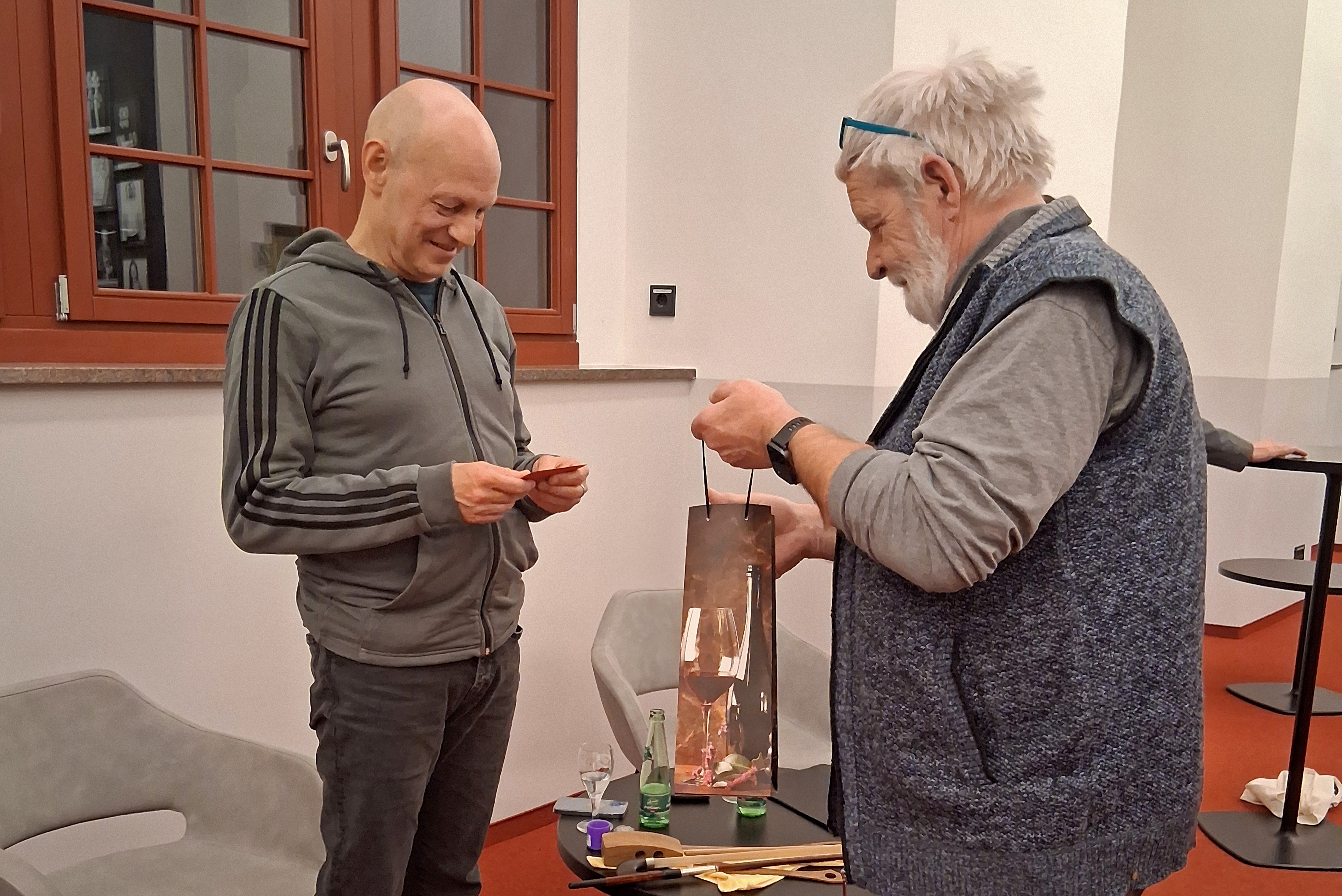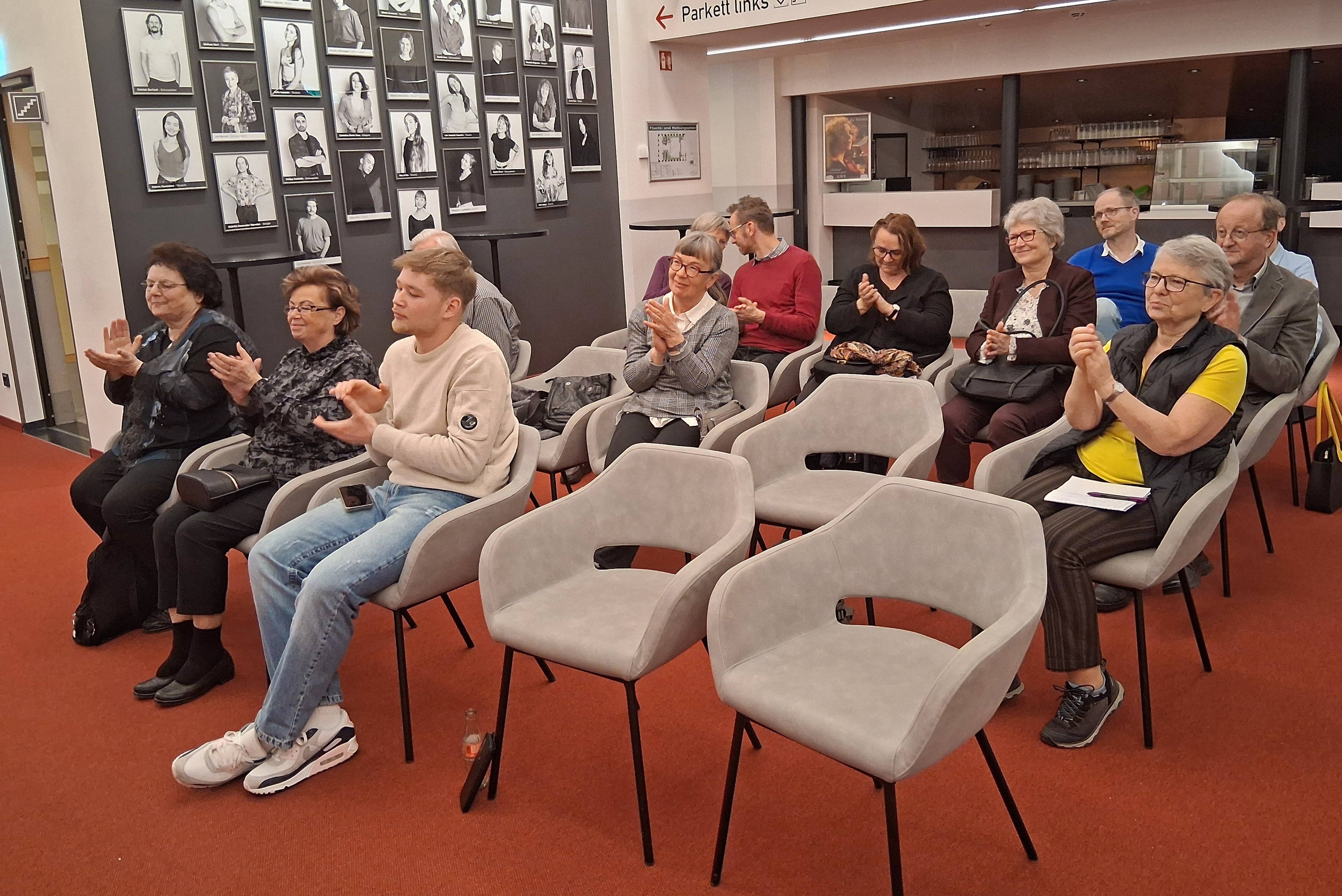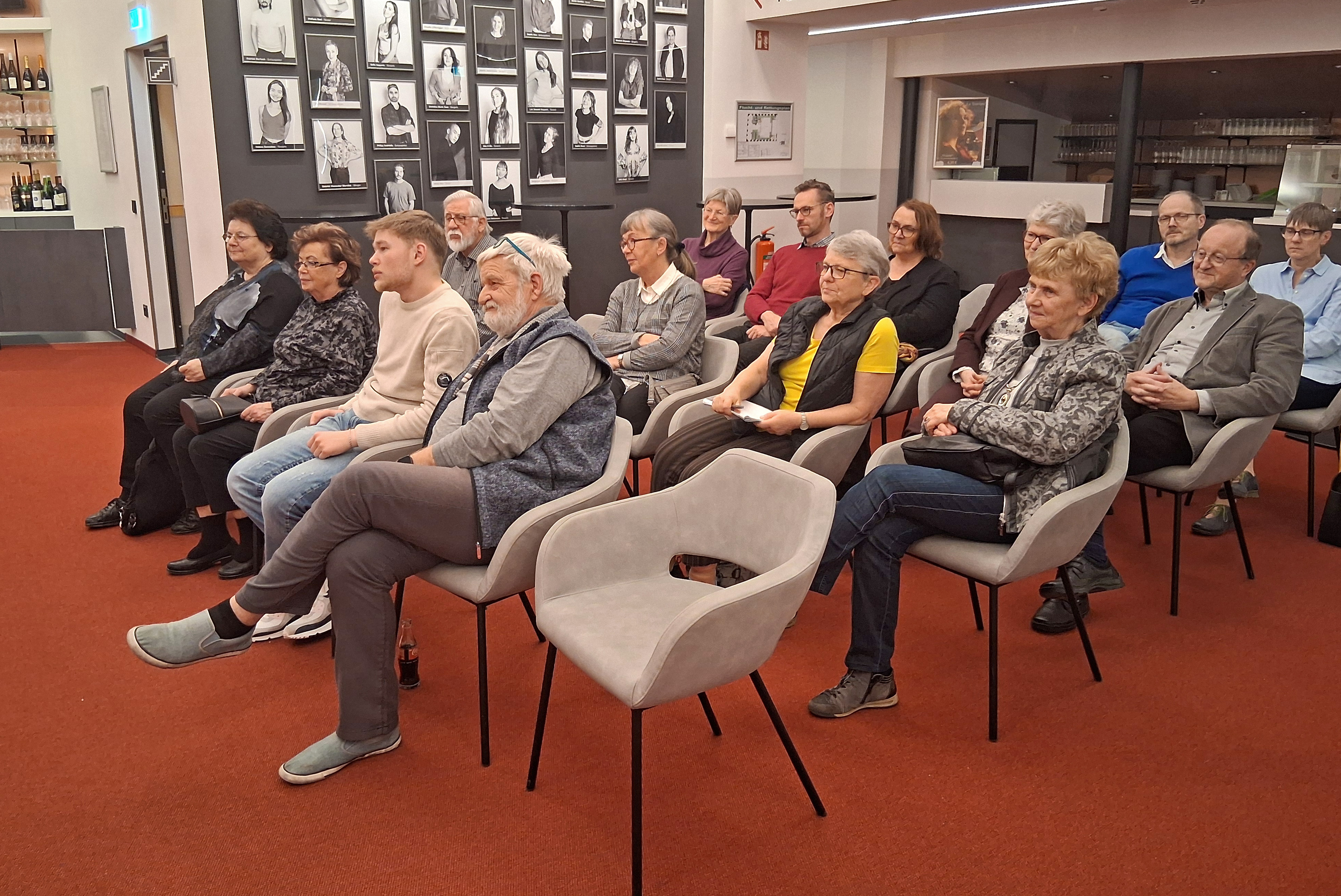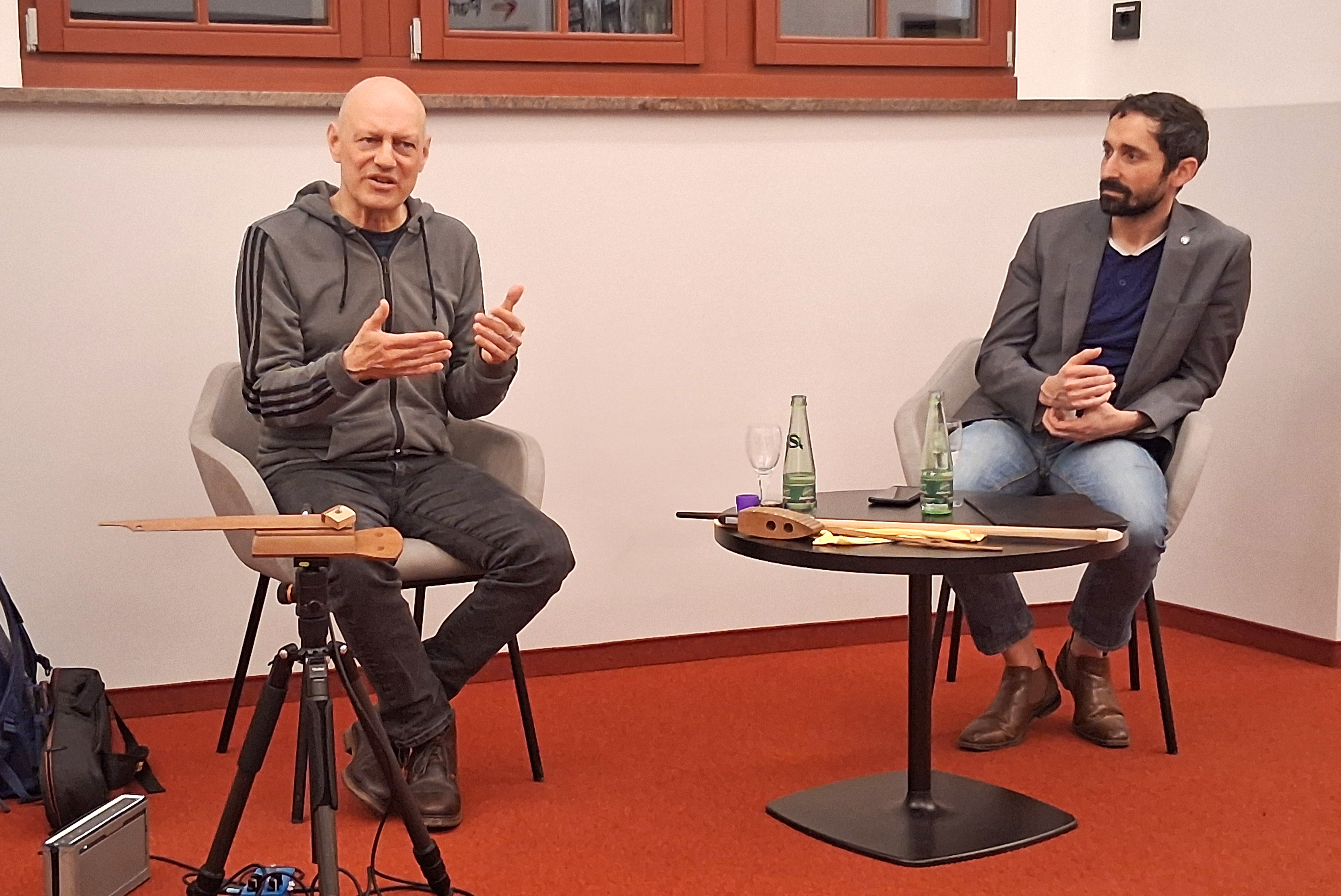 Im Gespräch mit Patrick Pühn erzählte Sebastian Undisz am 10.03.2025 von seinem künstlerischen Werdegang. Nach dem Studium von Komposition und Klavier in Dresden arbeitete er die Hälfte seines Lebens freischaffend. Da tut sich die Frage auf: Wo könnte man denn als Komponist eine Anstellung finden? Es gibt da interessante Möglichkeiten, zum Beispiel in Vergnügungsparks – oder eben im Theater. Hier sind die Aufgaben vielfältig, neben dem Komponieren, vor allem fürs Schauspiel, spielt Herr Undisz zum Teil selbst mit (vor allem in den Musicals), studiert Chöre und Bands ein, leitet die Vorstellung, muss Noten an die Gegebenheiten des Ensembles anpassen… Neben Klavier hat er bereits früh auch Interesse für andere Instrumente gehabt, z. B. Gitarre und Querflöte. Und er ist ständig auf der Suche nach neuen Instrumenten, um Personen und Handlungen auf der Bühne möglichst individuell zeichnen zu können. Bei der Suche nach Musik für „Richard III“ stieß er auf das von dem Wuppertaler Gitarristen Hans Reichel erfundene Daxophon – dem er ganz spannende, surreale Töne entlockt. Gespannt lauschten wir auf die vielen unterschiedlichen Facetten dieses Instruments, bei dem eine Holzzunge zum Schwingen gebracht wird. Als spannend beischrieb Sebastian Undisz auch die Zusammenarbeit mit den Schauspielern, die so ganz anders ist als mit professionellen Sängern. Seit ca. 35 Jahren ist der „Schauspielkapellmeister“ an verschiedenen Theatern tätig, seit etwa 13 Jahren zusammen mit Dirk Löschner und nun seit ca. 2,5 Jahren im Theater Plauen-Zwickau. Besonders mag er, wie er uns erzählte, die Arbeit an Weihnachtsmärchen, von denen er mindestens 30 musikalisch ausgestattet hat. Und dabei ist es spannender, Bösewichte mit Musik zu zeichnen, als immer nur „die Guten“. Nach einem Ausflug in die phantasievolle Welt des „Voynich-Manuskripts“ und einer weiteren Kostprobe am Dachsophon ging wieder ein spannender Stammtisch zu Ende.