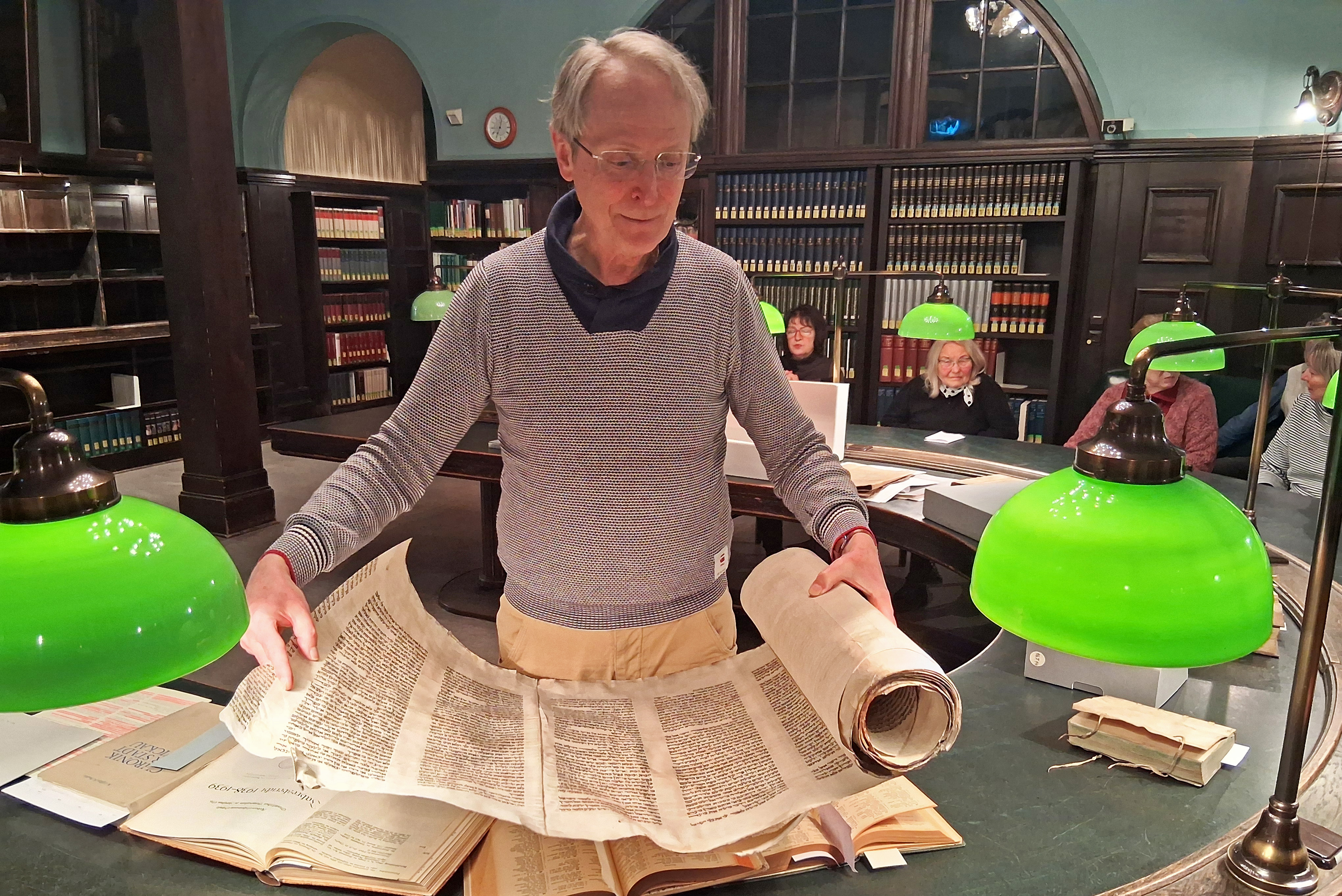 Für die nächsten Jahre wird sich die Ratsschulbibliothek im Verwaltungszentrum der Stadt Zwickau befinden. Das Thema unseres Stammtischs war „Jüdisches Leben in Zwickau“. Herr Dr. Mahnke wusste wieder viel Spannendes zu berichten über die recht wechselvolle Geschichte der Ansiedlung von Juden in Zwickau. So gab es bereits in der ersten Hälfte des 14. Jahrhunderts eine Judengasse, und man geht von 8-10 jüdischen Familien aus. Es ist nachweisbar, dass 1504 das erste Pogrom stattfand und bis 1543 alle Juden aus Zwickau vertrieben wurden. Ende des 19./ Anfang des 20. Jahrhunderts gab es in Zwickau wieder wohnhafte Juden mit 2 Betsälen, die 1938 in der Reichspogromnacht zerstört wurden. Die abgebrannten Gebäude mussten von den Jüdinnen und Juden selbst beräumt werden. Und da beginnt eine unglaubliche Geschichte: Kurz nach der Pogromnacht hat die Klasse eines Gymnasiums erst das Museum besucht. Dann kamen einige Knaben auf die Idee, auf den nahegelegenen Sportplatz zu gehen, auf den der Schutt aus den Synagogen gebracht worden war. Dabei fanden sie 3 Rollen: hebräische Buchstaben auf Pergament. Sie vermuteten, etwas Wertvolles gefunden zu haben und wollten es dem Museum für 5 RM verkaufen. Wir wissen inzwischen, dass es sich um eine große (17 m lange) und zwei kleine Thorarollen handelte. Das Museum zeigte sich nicht interessiert, oder es fehlte der Mut, und so wurden die Schüler zur NSDAP-Kreisleitung geschickt. Auch dort wurden sie die Rollen nicht los. Schließlich wurden sie ihnen doch im Museum abgenommen und in der Handschriftensammlung bis 2002 gut verwahrt. Herr Dr. Mahnke konnte zu dieser Zeit Kontakt zu den noch lebenden ehemaligen Gymnasiasten aufnehmen und erfuhr so die ganze Geschichte. Heute befindet sich die große Rolle bei der Jüdischen Gemeinde Chemnitz – auch da gibt es in der Bibliothek noch Dokumente über den Festakt im Jahr 2003 zur Übergabe. Der Höhepunkt unseres Abends in der Bibliothek war die Vorführung der leicht versengten, in Zwickauer Besitz befindlichen Thorarollen. Die jüdische Geschichte in Zwickau endete vorerst vor dem 2. Weltkrieg mit der Deportation der noch in der Stadt verbliebenen Jüdinnen und Juden in die Vernichtungslager. Trotz des eigentlich traurigen Themas verstand es der Direktor der Ratsschulbibliothek uns auf unterhaltsame Weise und anhand von verschiedenen Büchern wieder ein Stück Zwickauer Geschichte näherzubringen.