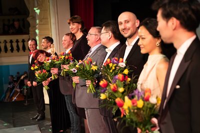 „And the Oscar goes to…“ – Wer kennt diesen Satz nicht? Unter den über 40 Nominierten des Theaters vom Generalintendanten bis zum Einlassdienst machte ein Ensemble das Rennen: Theaterliebling der Spielzeit 2023/24 ist der Opernchor. Dieser wurde extra für die Verleihung ins Ballhaus „gelockt“, und die Überraschung war groß. Norman Sengewald vom Chorvorstand nahm den Preis stellvertretend für alle in Empfang. Wir beglückwünschen den Opernchor und danken allen, die an der Abstimmung teilgenommen haben. Sie zeigt, dass viele Hände – vor und hinter der Bühne – nötig sind, um eine Inszenierung auf die Beine zu stellen.