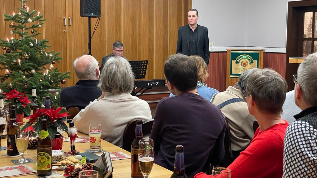 Und wie es ebenso zur Tradition geworden ist, bereiteten uns Künstler des Theaters ein kleines vorweihnachtliches Programm. In einer kurzen Begrüßung dankte unser Vorsitzender, Henry Klüglich, der Technik, den Künstlern und Frau Zeuner, dass sie uns wieder begleiten wollen, dazu auch ganz herzlich den Mitarbeitern der Mauritius-Brauerei für ihre freundliche Unterstützung. Das wurde von den Anwesenden mit herzlichem Beifall unterstrichen. Er erinnerte auch nochmal an die laufende Abstimmung zum Theaterliebling, die Ende Februar 2024 endet.