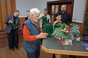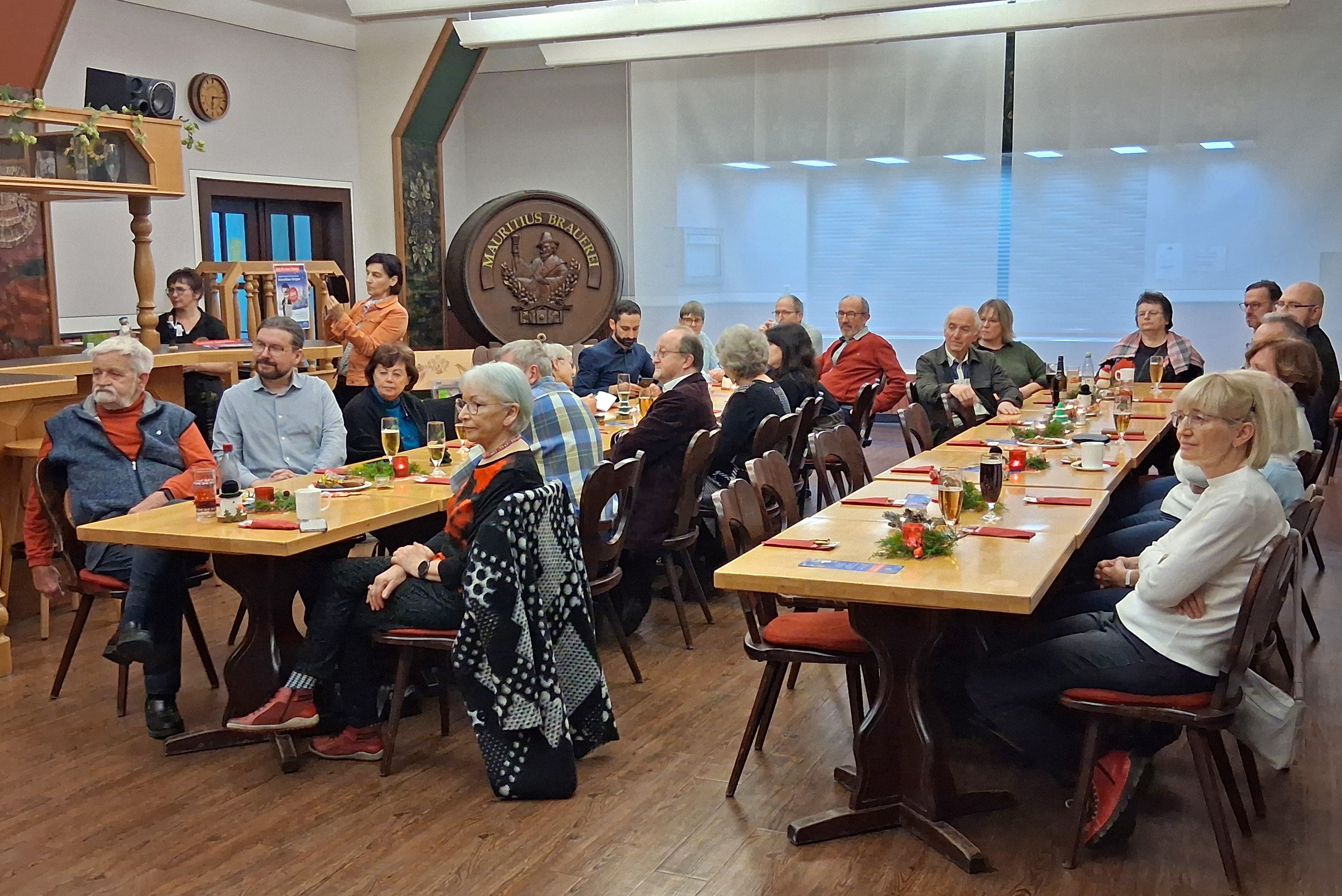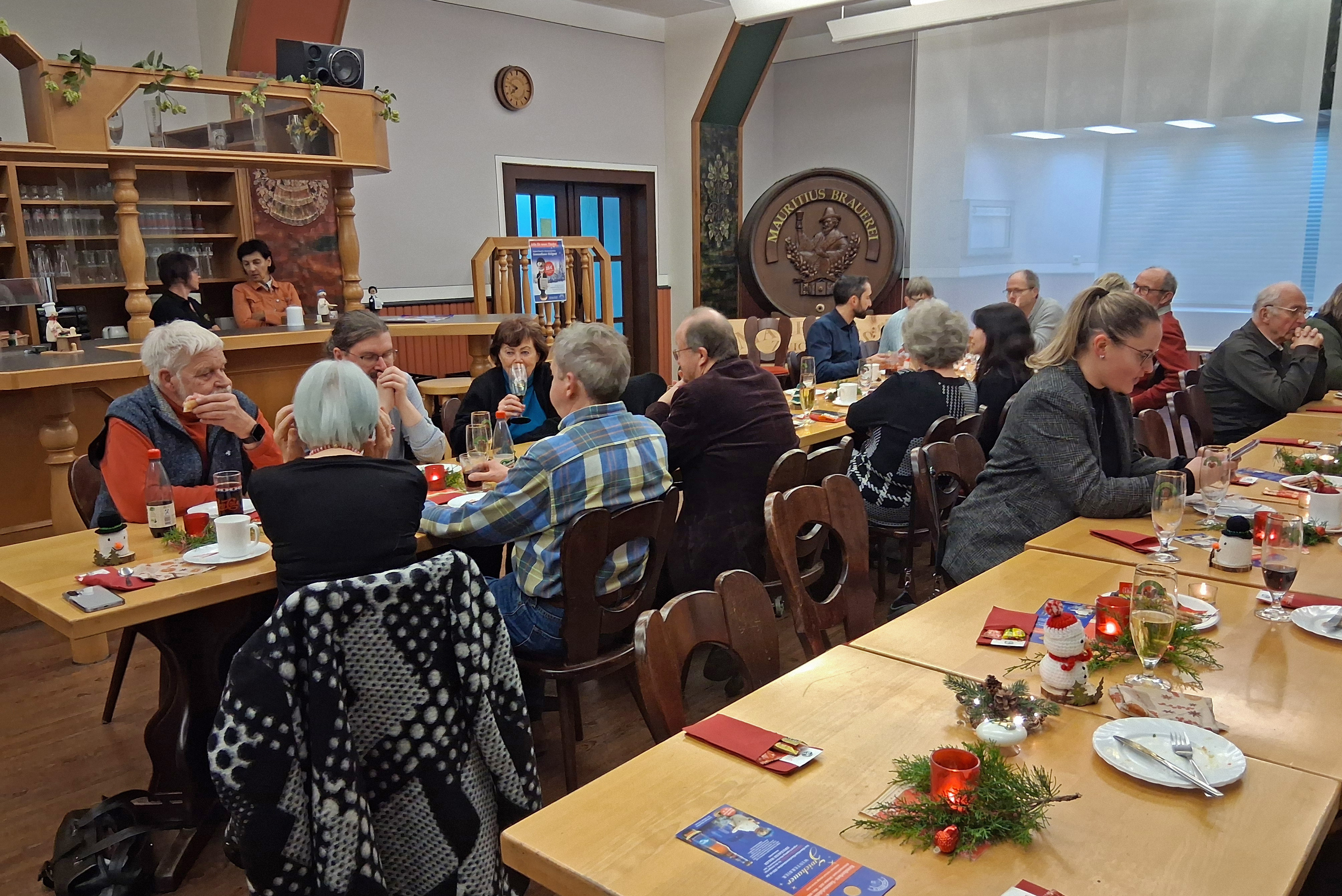 Nach einem aufregenden, ereignisreichen Jahr trafen wir uns auch diesmal wieder zu unserer traditionellen Weihnachtsfeier im Schalander der Mauritius-Brauerei, um das Jahr in gemütlicher Runde ausklingen zu lassen. Auf den festlich geschmückten Tischen lagen außer einigen Knabbereien auch kleine Päckchen für jeden mit dem Pin des Theaters. Damit können wir uns jederzeit als Freunde des Theaters outen.