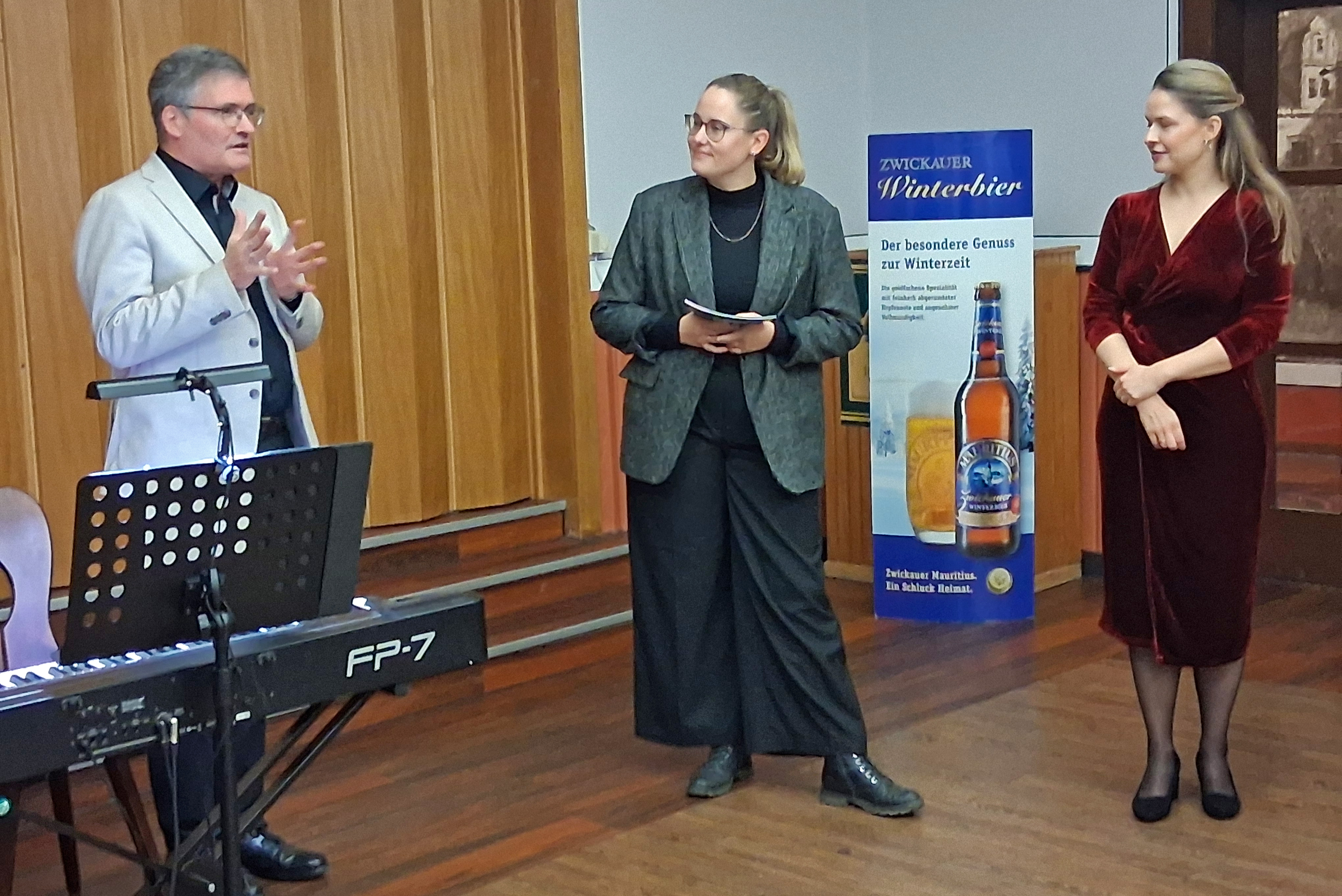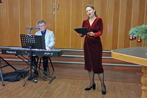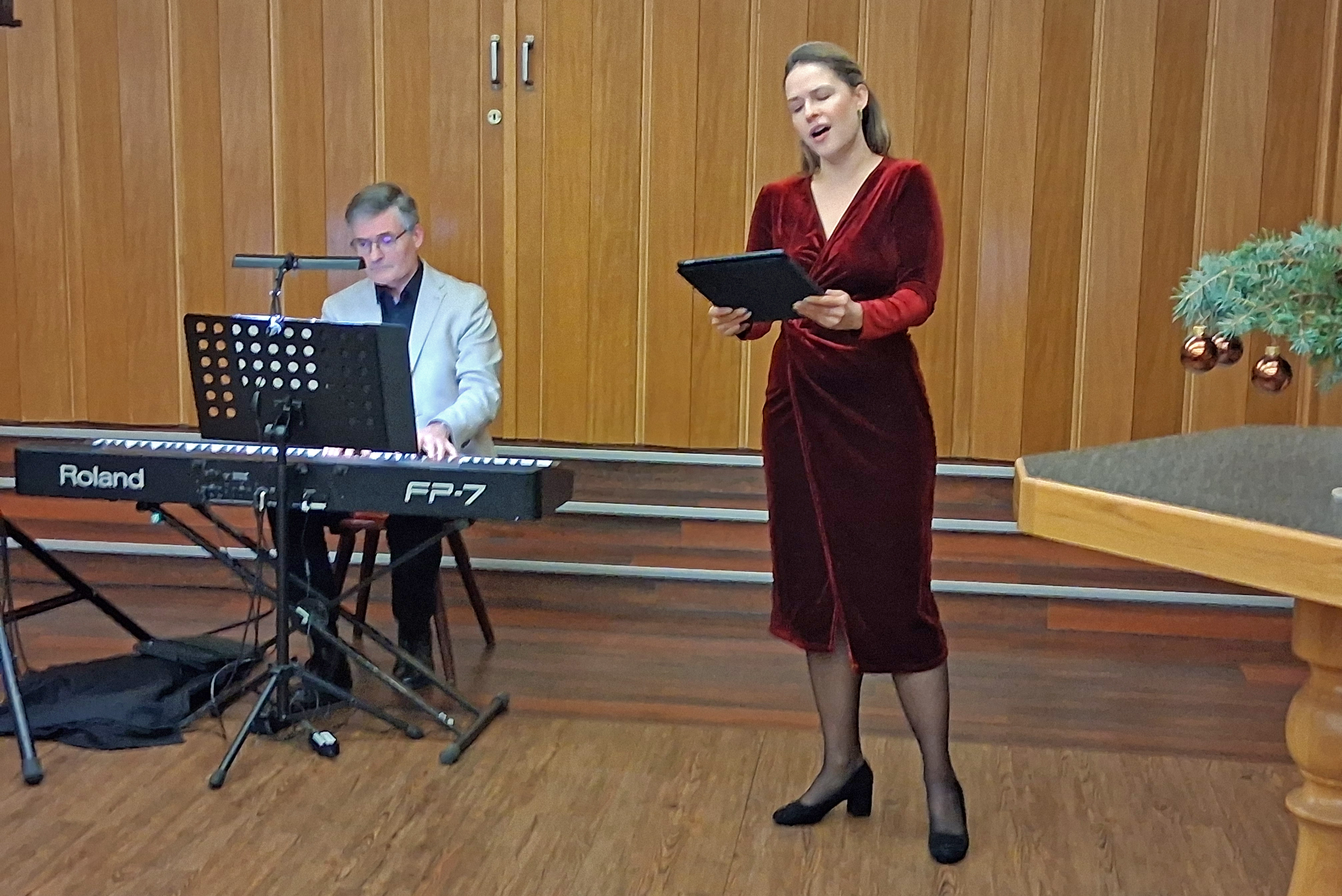 Schon zum vierten Mal führte uns Anne Sandmann durch ein kleines Programm. Zu Gast war – neben Matthias Spindler – die junge Sopranistin Natalia Willot-Förster. Nach „Oh holy night“ berichtete uns Natalia Willot-Förster, wie sie auf einer Zugfahrt nach St. Petersburg von der Direktorin einer Musikschule entdeckt wurde. Zu den weihnachtlichen Traditionen in ihrer Heimat befragt, meinte sie, zu Essen gibt es „alles mit Mayonnaise“. Und eigentlich wurde früher in der Sowjetunion erst am 07.01. Weihnachten gefeiert. Dafür aber ganz groß das neue Jahr begrüßt. Mit „Maria durch ein Dornwald ging“ endete das kleine festliche Konzert unter großem Applaus aller Anwesenden.