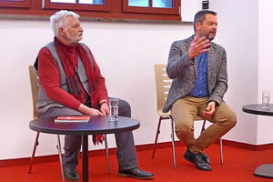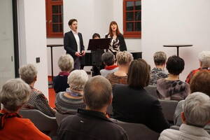 EXTRA aus Frankfurt am Main angereist war ein berühmter Literaturkritiker, der in seiner Laudatio - mehr oder weniger wohlwollend - auf die Lesung von Heinrich Schulze einstimmte. Er machte neugierig und alle Zuhörer im gut gefüllten Malsaal warteten gespannt auf die Lesung.