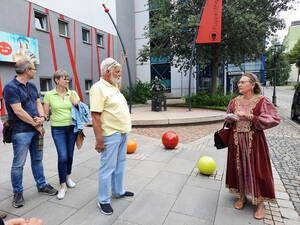 Auf den Spuren der Neuberin waren wir am 27.06.2023 unterwegs in Zwickau. Dazu hatte sich Frau Dr. Ute Haese in ein Gewand gekleidet, das uns gleich in die Zeit von Caroline Neuber zurückversetzte. Natürlich waren alle gespannt, möglichst viel Neues über das Leben unserer Namenspatronin zu erfahren - und das ist auch auf beeindruckende Weise gelungen.