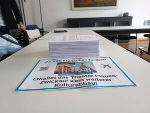 Im Peter-Mergenthal-Raum des Zwickauer Rathauses waren die Zwickauer Oberbürgermeisterin, Frau Arndt, die Geschäftsführerin des Theaters, Frau Kaiser, der Betriebsratsvorsitzende des Theaters, Herr Sandmann, sowie die Vorsitzenden der Theaterfördervereine Zwickau (Herr Klüglich) und Plauen (Herr Grimm) am 10.06.2025 zusammengekommen zur Übergabe von 24.669 Unterschriften auf der von den Fördervereinen Zwickau und Plauen initiierten Petition zum Erhalt des Theaters in seiner bisherigen Struktur.