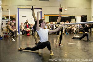 Der Theaterförderverein war zu seinem Stammtisch im Oktober in den Trainingsraum des Ballett-Ensembles des Theaters Plauen-Zwickau eingeladen. Beim Eintritt in den ehemaligen Sitzungsraum des Stadtrates konnten wir den Tänzern schon mal bei ihren Dehnungs- und Erwärmungsübungen auf dem Tanzteppich, der ursprünglich mal vom Theaterförderverein finanziert wurde, zusehen.